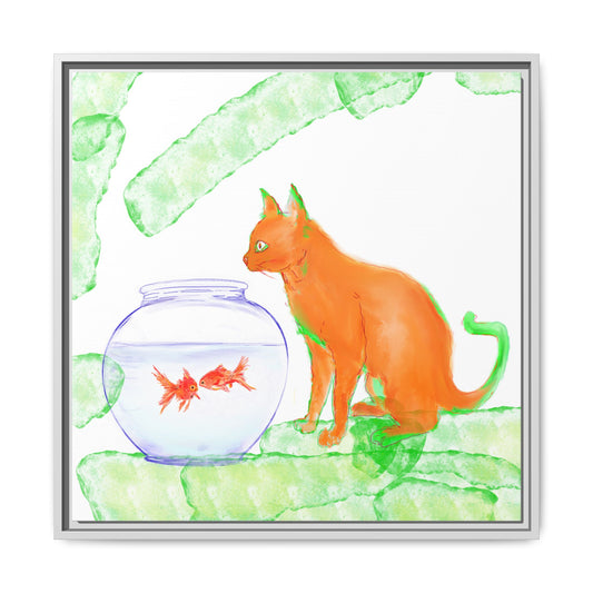 Wall Art Colorful Cat and Fish Bowl Matte Canvas Framed white