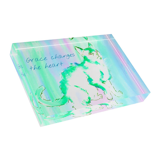 Art Decor Kitty Fun and Wisdom Acrylic Art Block in Green and Blue "Grace changes the heart"