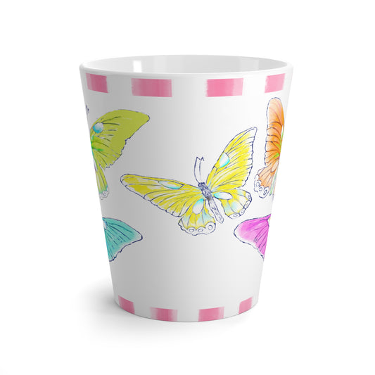 Butterfly Swing Latte Mug Aqua, Pink, Orange, Yellow Butterflies, Pink Stripe