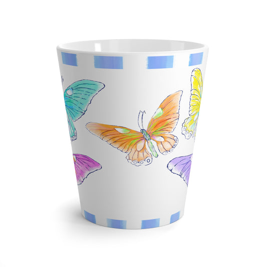 Butterfly Swing Latte Mug Aqua, Lilac, Pink , Orange, Yellow Butterflies, Blue Stripe