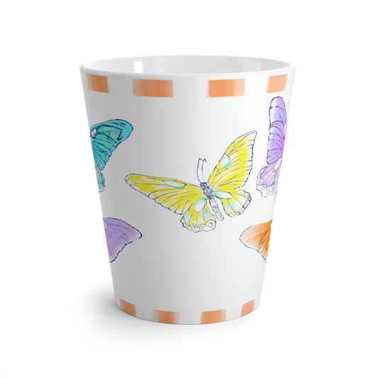 Butterfly Swing Latte Mug Aqua, Lilac, Pink, Orange , yellow Butterflies, Orange Stripe