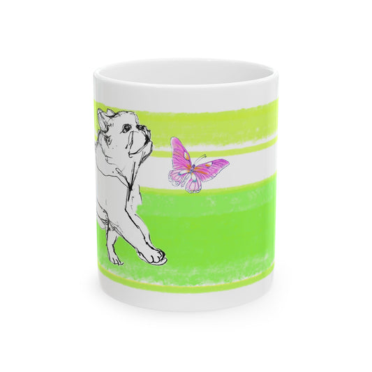 Mega Stripe Dogi Butterfly Flutter Ceramic Mug, (11oz, 15oz) Yellow Green Bulldog