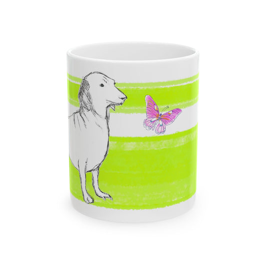 Mega Stripe Dogi Butterfly Flutter Ceramic Mug, (11oz), Lime Dachshund
