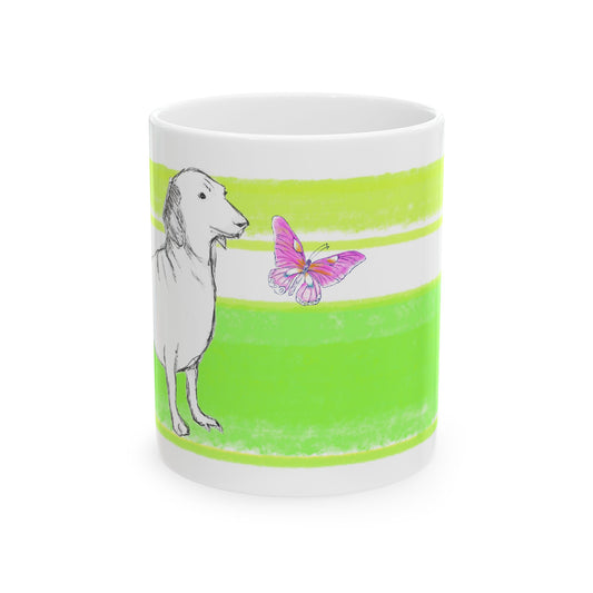 Mega Stripe Dogi Butterfly Flutter Ceramic Mug, (11oz, 15oz) Yellow Green Dachshund
