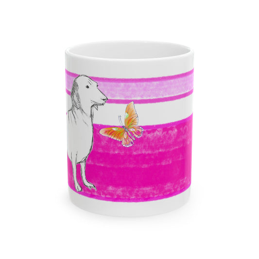 Mega Stripe Dogi Butterfly Flutter Ceramic Mug, (11oz, 15oz), Raspberry Pink Dachshund