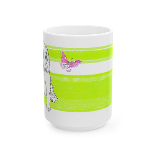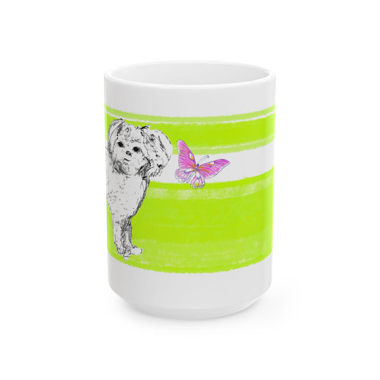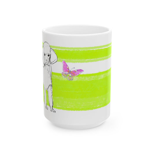 Mega Stripe Dogi Butterfly Flutter Ceramic Mug, (11oz, 15oz) Yellow Green Poodle