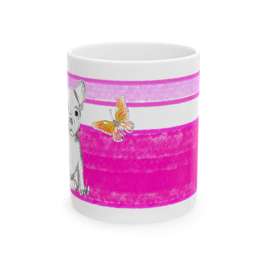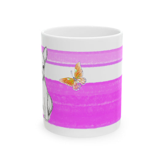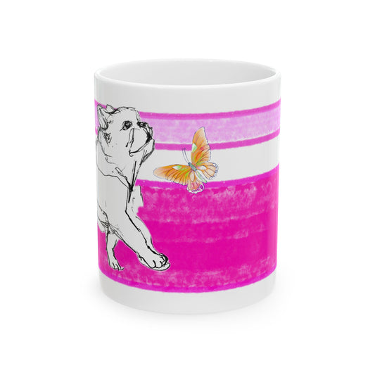 Mega Stripe Dogi Butterfly Flutter Ceramic Mug, (11oz, 15oz), Raspberry Pink Bulldog