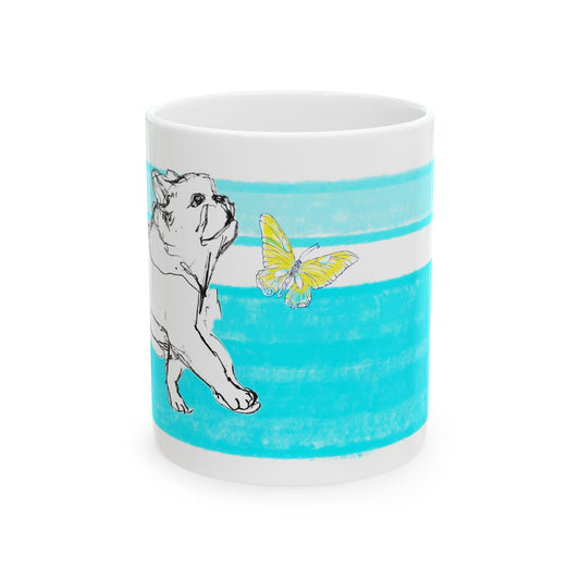 Mega Stripe Dogi Butterfly Flutter Ceramic Mug, (11oz, 15oz), Aqua, Bulldog