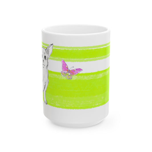 Mega Stripe Dogi Butterfly Flutter Ceramic Mug, (11oz, 15oz) Yellow Green Chihuahua