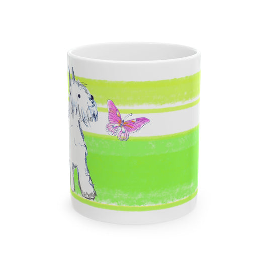 Mega Stripe Dogi Butterfly Flutter Ceramic Mug, (11oz, 15oz) Yellow Green Schnauzer