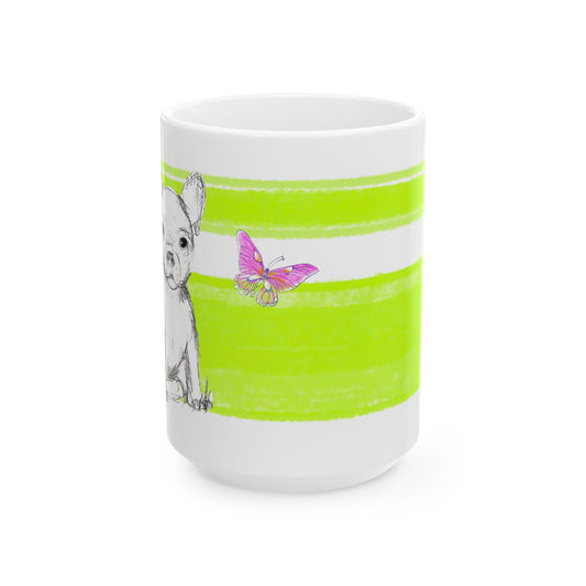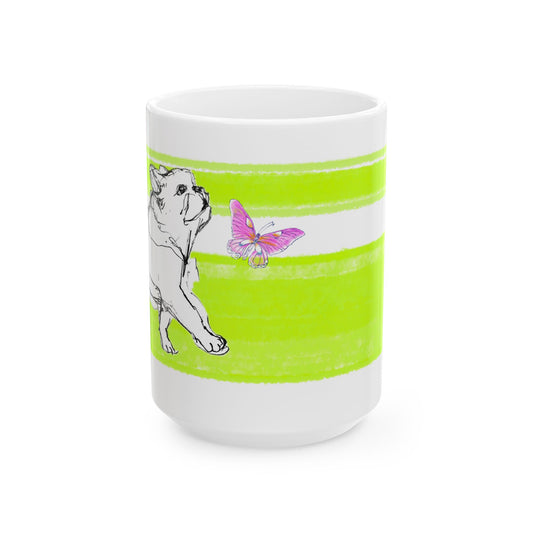 Mega Stripe Dogi Butterfly Flutter Ceramic Mug, (11oz, 15oz), Lime Bulldog