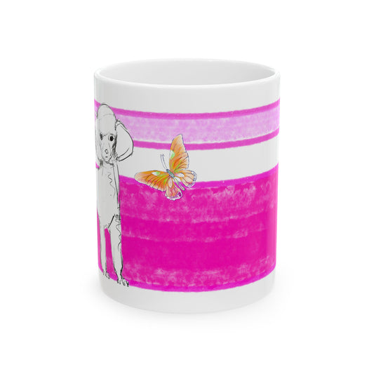 Mega Stripe Dogi Butterfly Flutter Ceramic Mug, (11oz, 15oz), Raspberry Pink Poodle