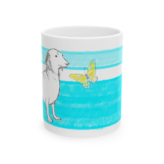 Mega Stripe Dogi Butterfly Flutter Ceramic Mug, (11oz, 15oz), Aqua Dachshund
