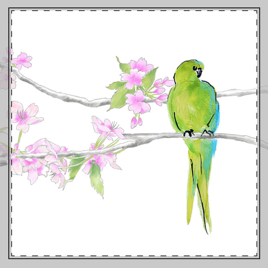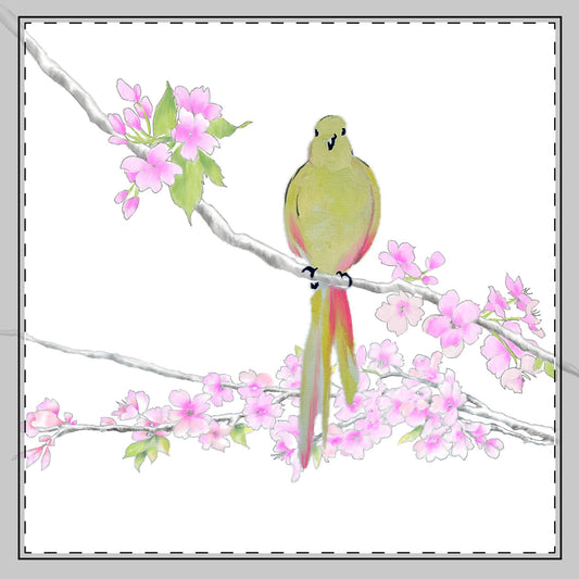 Blossoms & Birds in Yellow Green, Poly Twill Napkin , Background fabric in Bright White