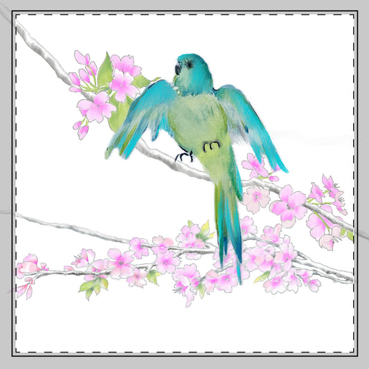 Blossoms & Birds in Blue-Green Poly Twill Napkin, Background Color Bright White