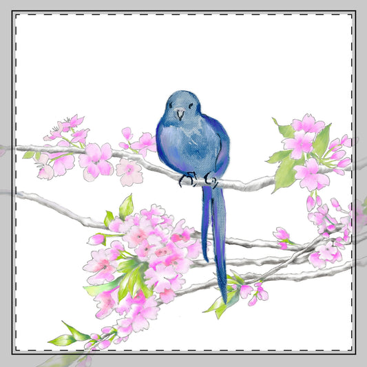 Blossoms & Birds in Dark Blue Poly Twill Napkin , Background Fabric Color, Bright White