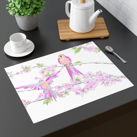 Blossoms & Birds in Pink ,Poly Quilted Placemat, Poly , Background Bright White, # 1, Head of Table