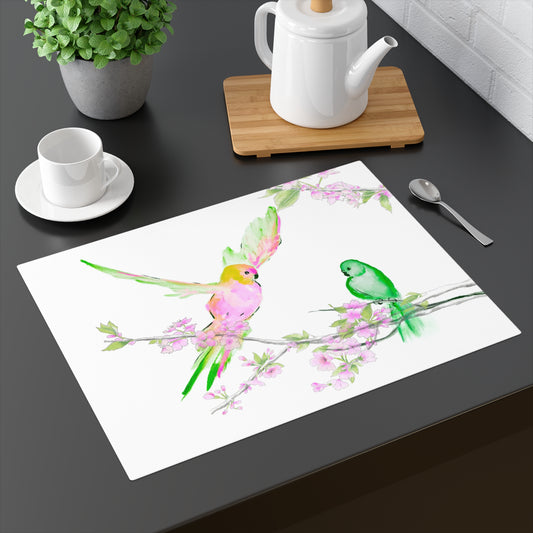 Blossoms & Birds in Pink, Aqua, Green ,Quilted Placemat, Poly , Background Bright White, # 4 Right Side of Table