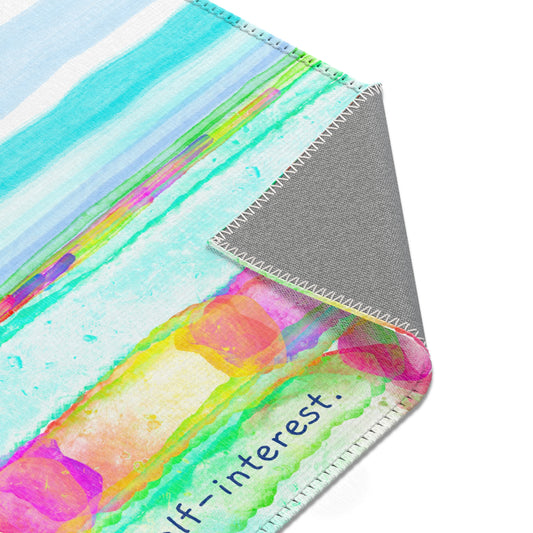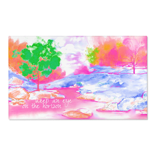 Inspirational Landscapes Indoor/Outdoor Area Rug, "Keep an eye on the horizon", Raspberry, Blue, and Green Non-slip
