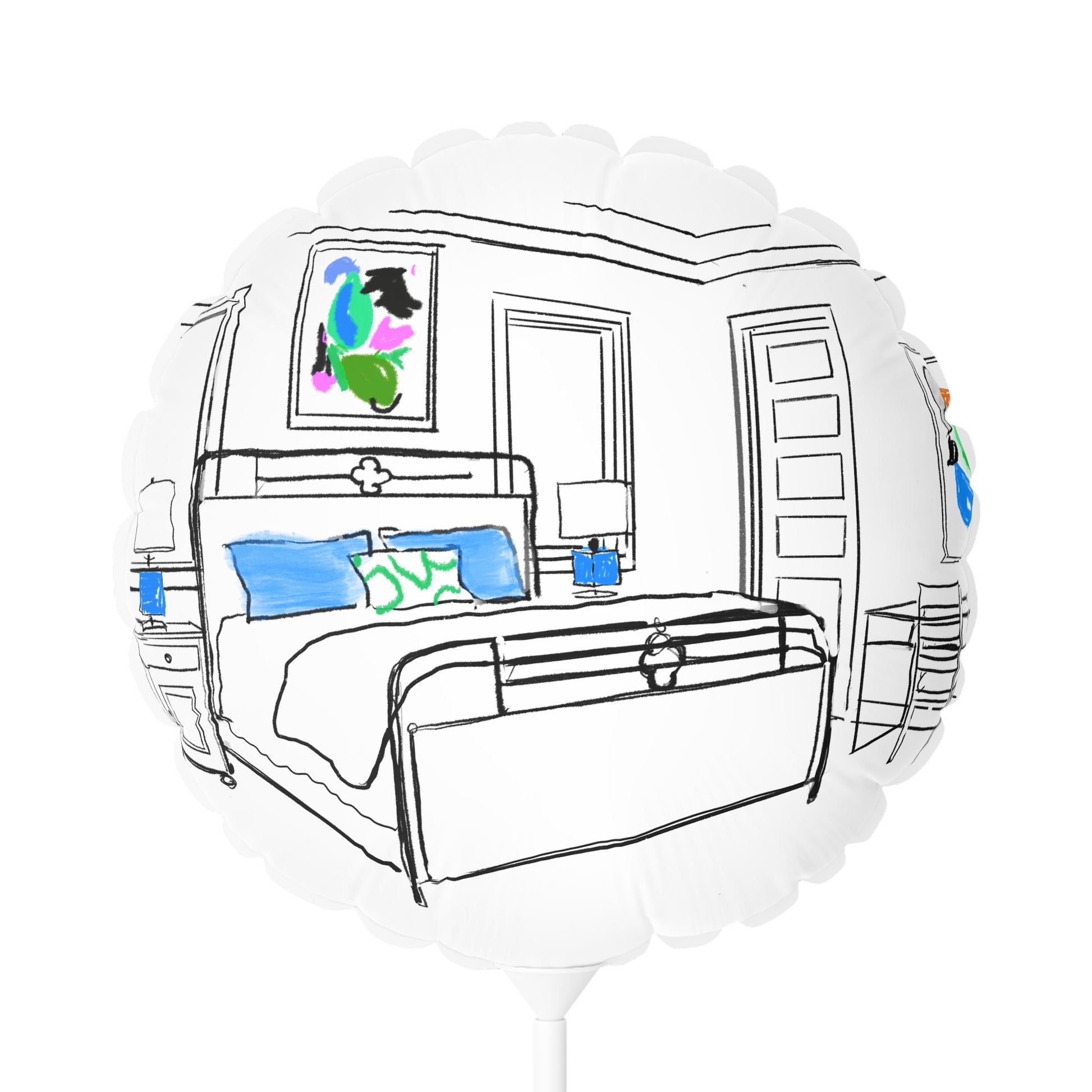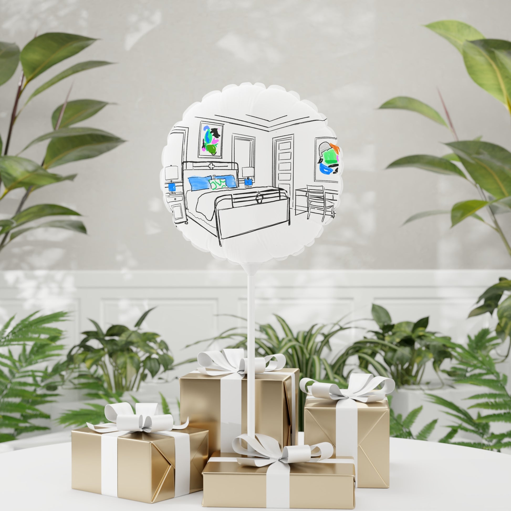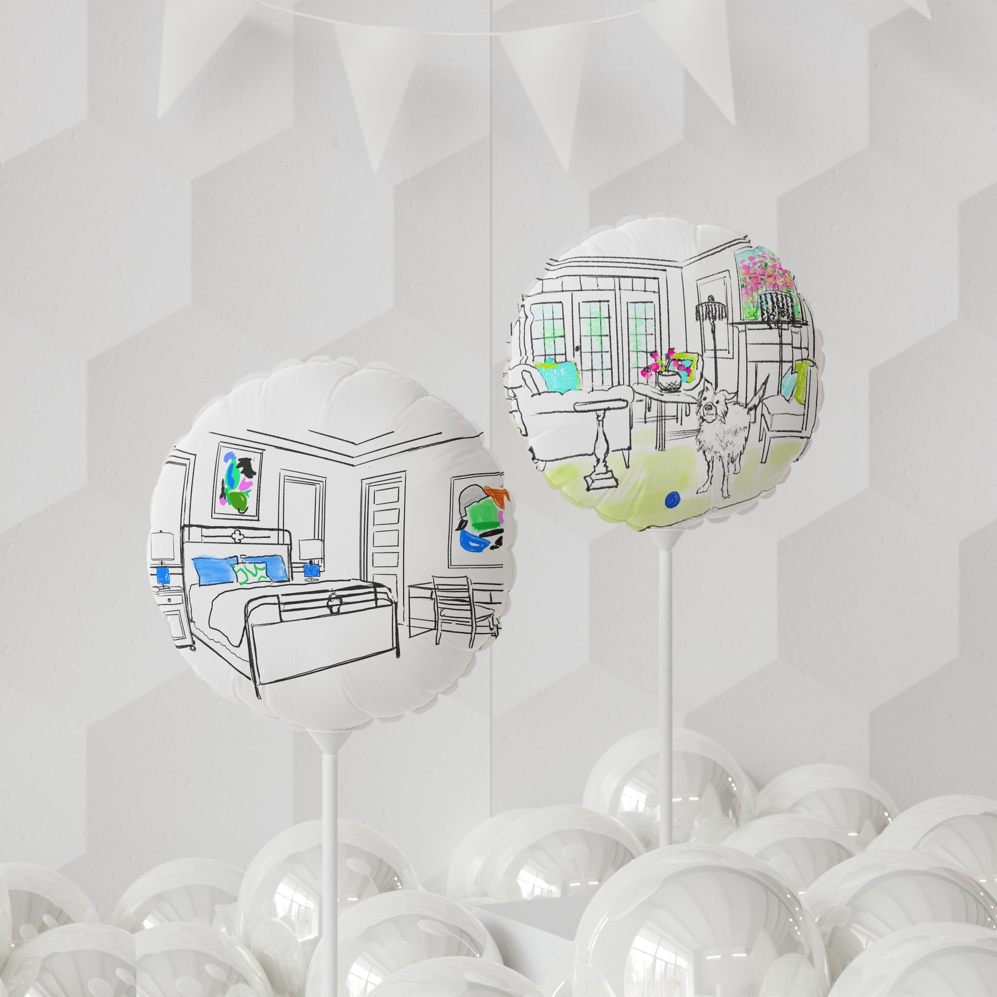 Step into a celebration of home with Joyful Rooms! These 11" x 11" Mylar balloons showcase hand-illustrated sketches of cozy, welcoming rooms by Lois Moore of Periwinkles Interiors. Each balloon tells a little story of a perfect gathering space – a sunlit living room ready for laughter, a charming dining nook for shared meals, or a whimsical corner where friends gather to celebrate.