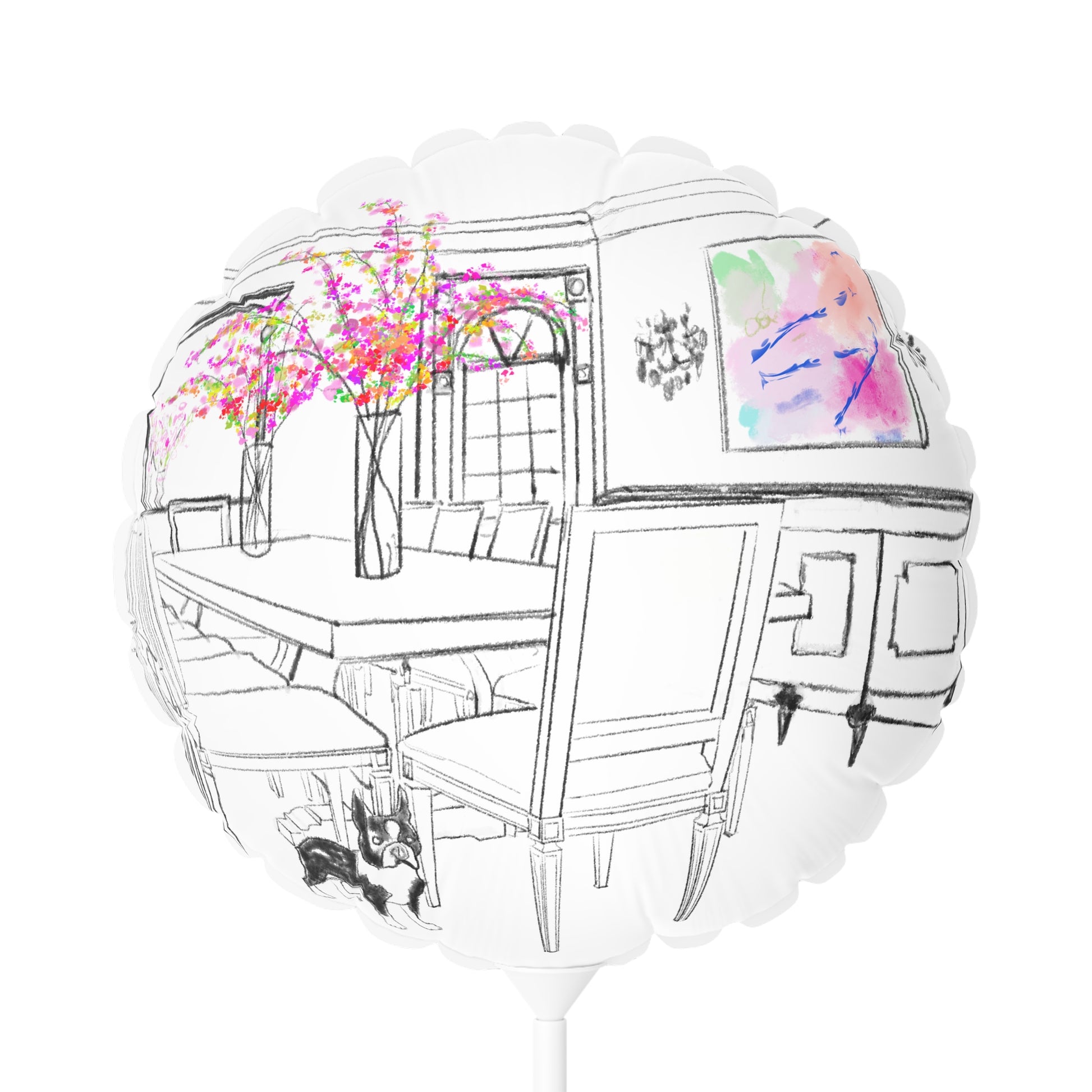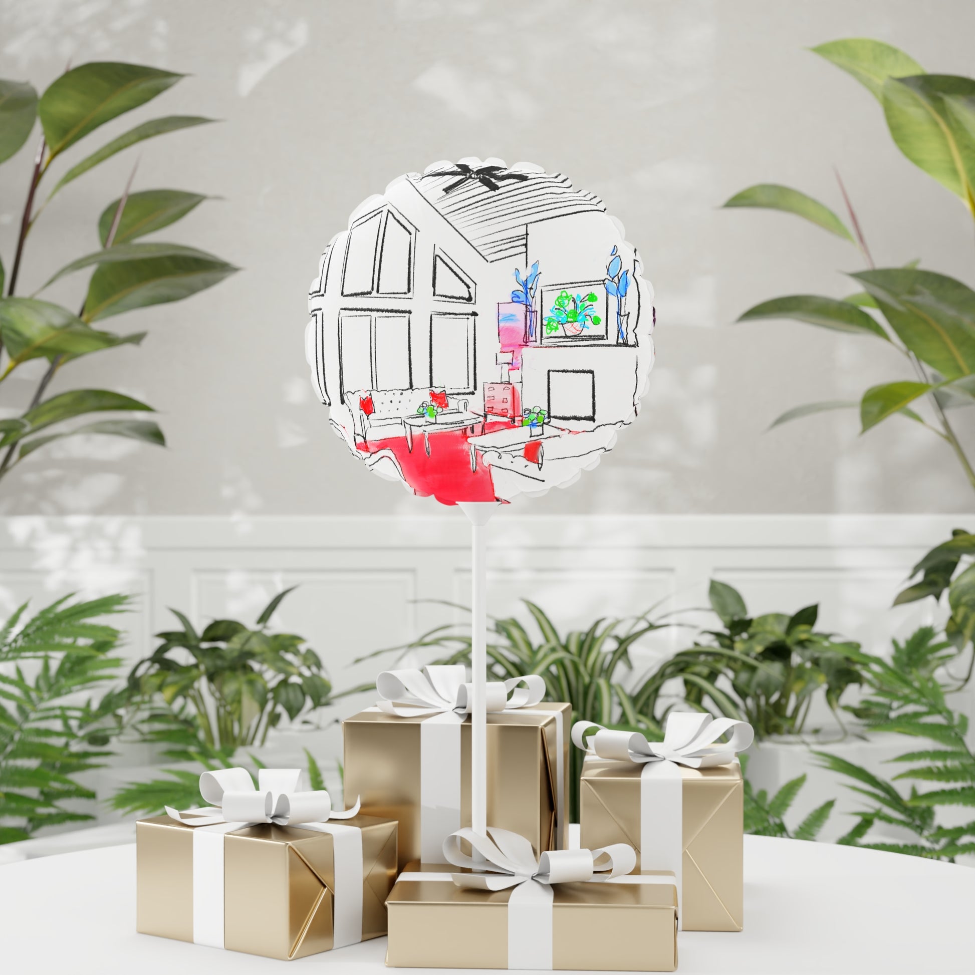 Step into a celebration of home with Joyful Rooms! These 11" x 11" Mylar balloons showcase hand-illustrated sketches of cozy, welcoming rooms by Lois Moore of Periwinkles Interiors. Each balloon tells a little story of a perfect gathering space – a sunlit living room ready for laughter, a charming dining nook for shared meals, or a whimsical corner where friends gather to celebrate.