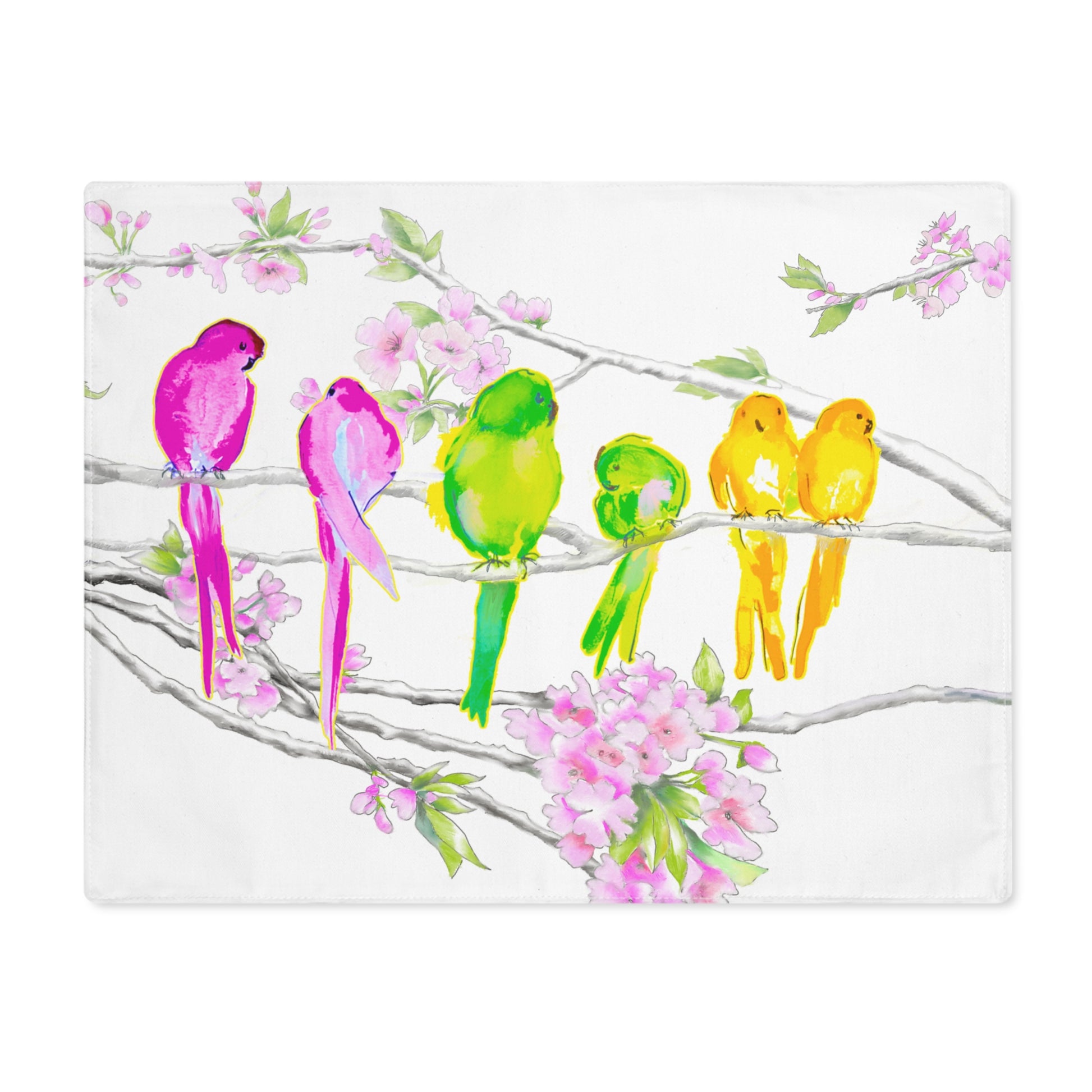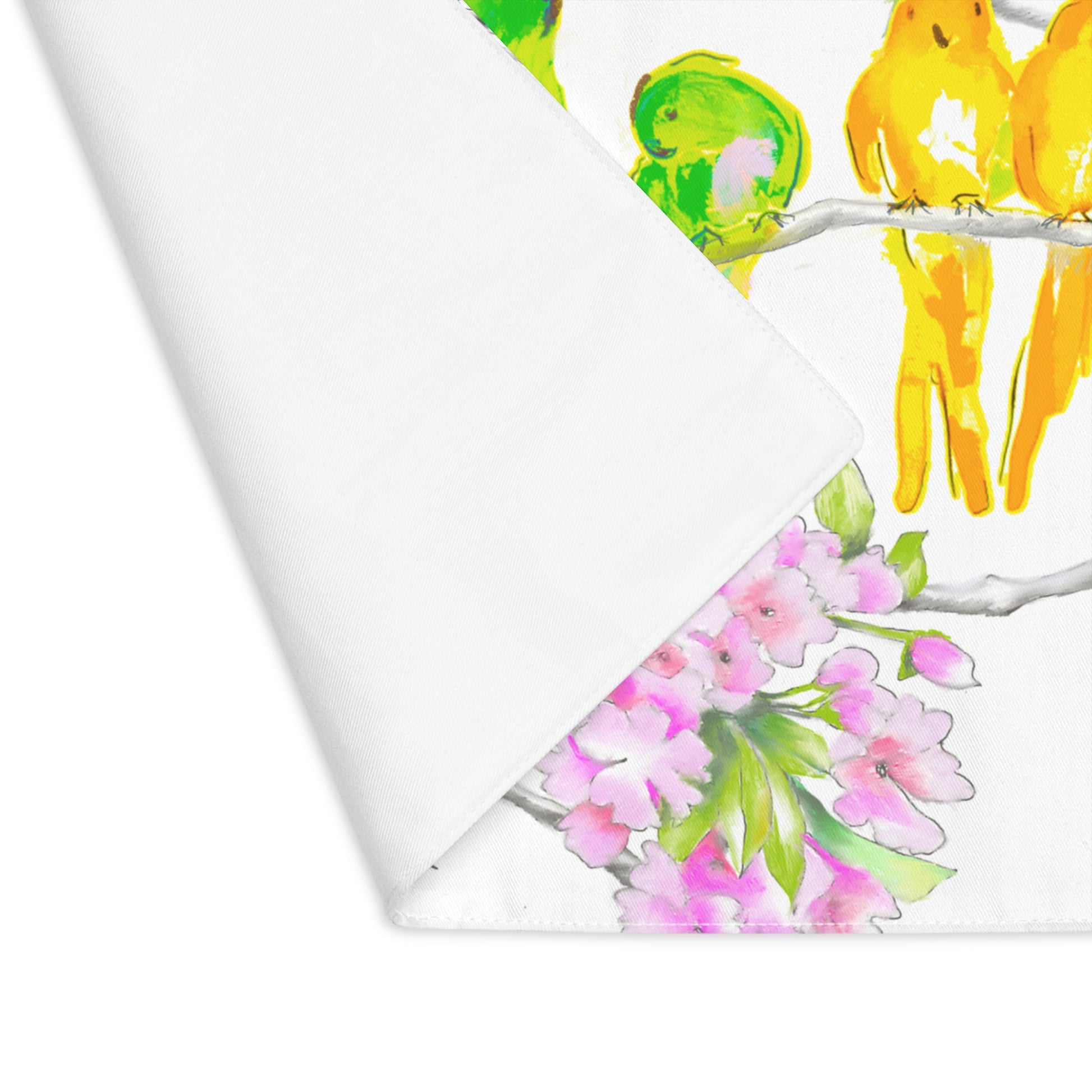 Blossoms & Birds In Raspberry, Green & Yellow Placemat, 1pc (18" × 14"), Cotton, Creamy White Background, #4 Right Side of Table