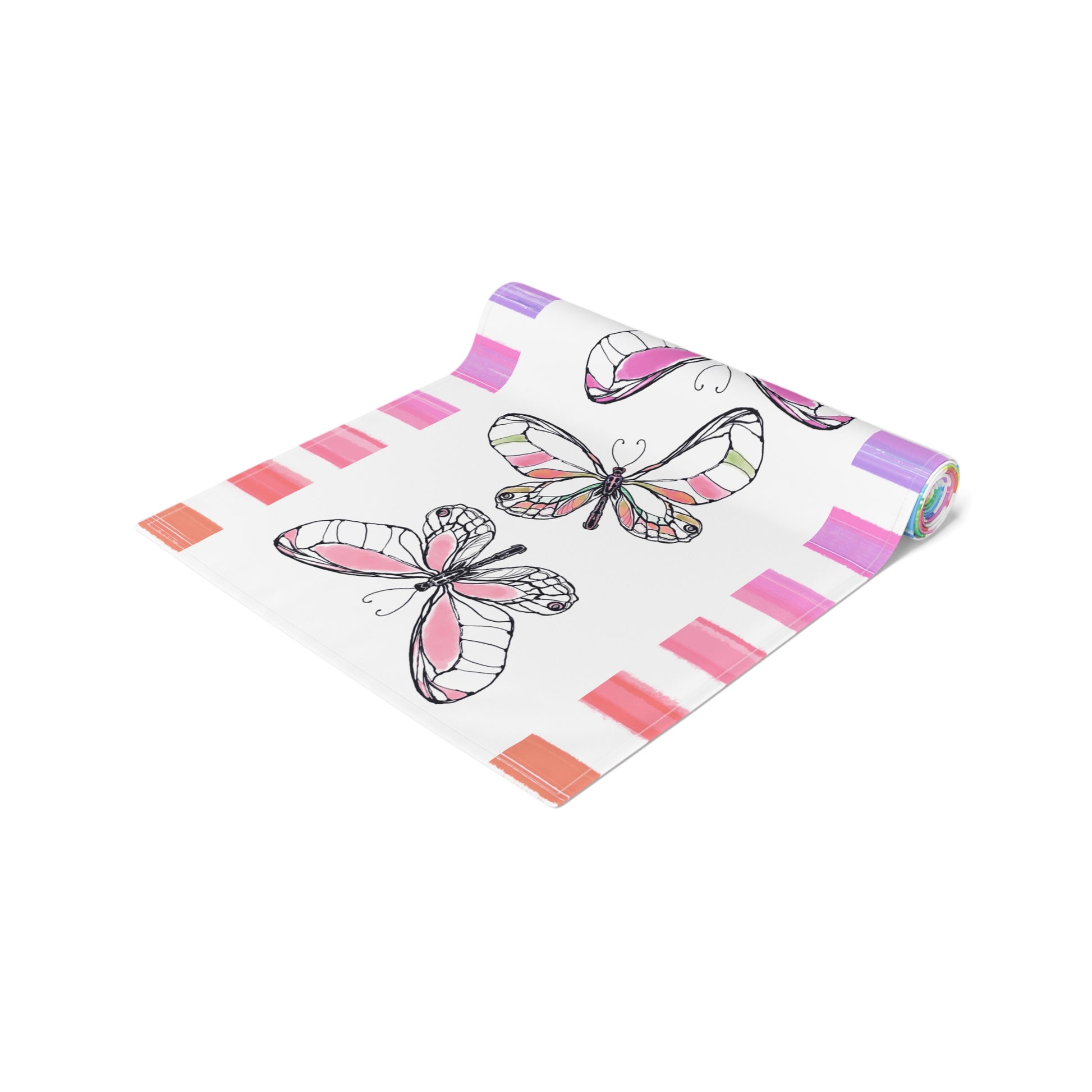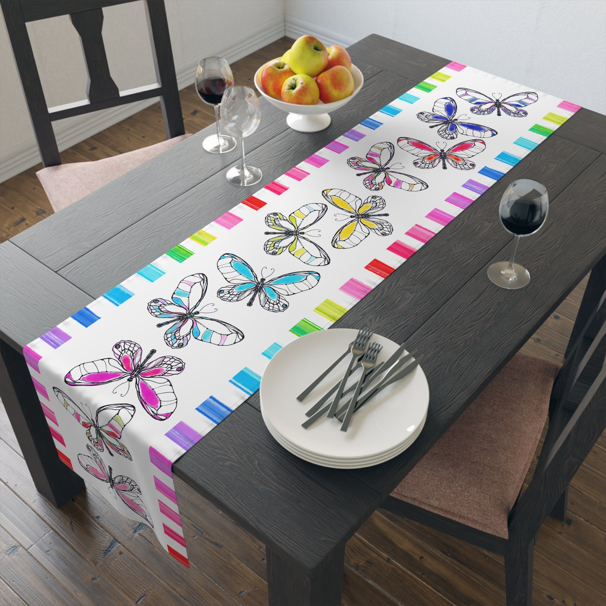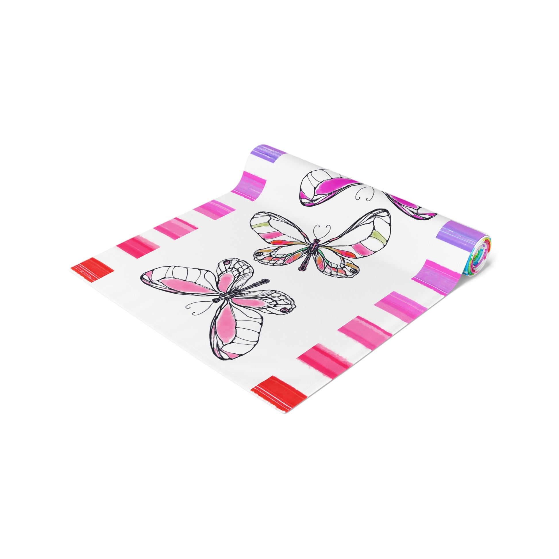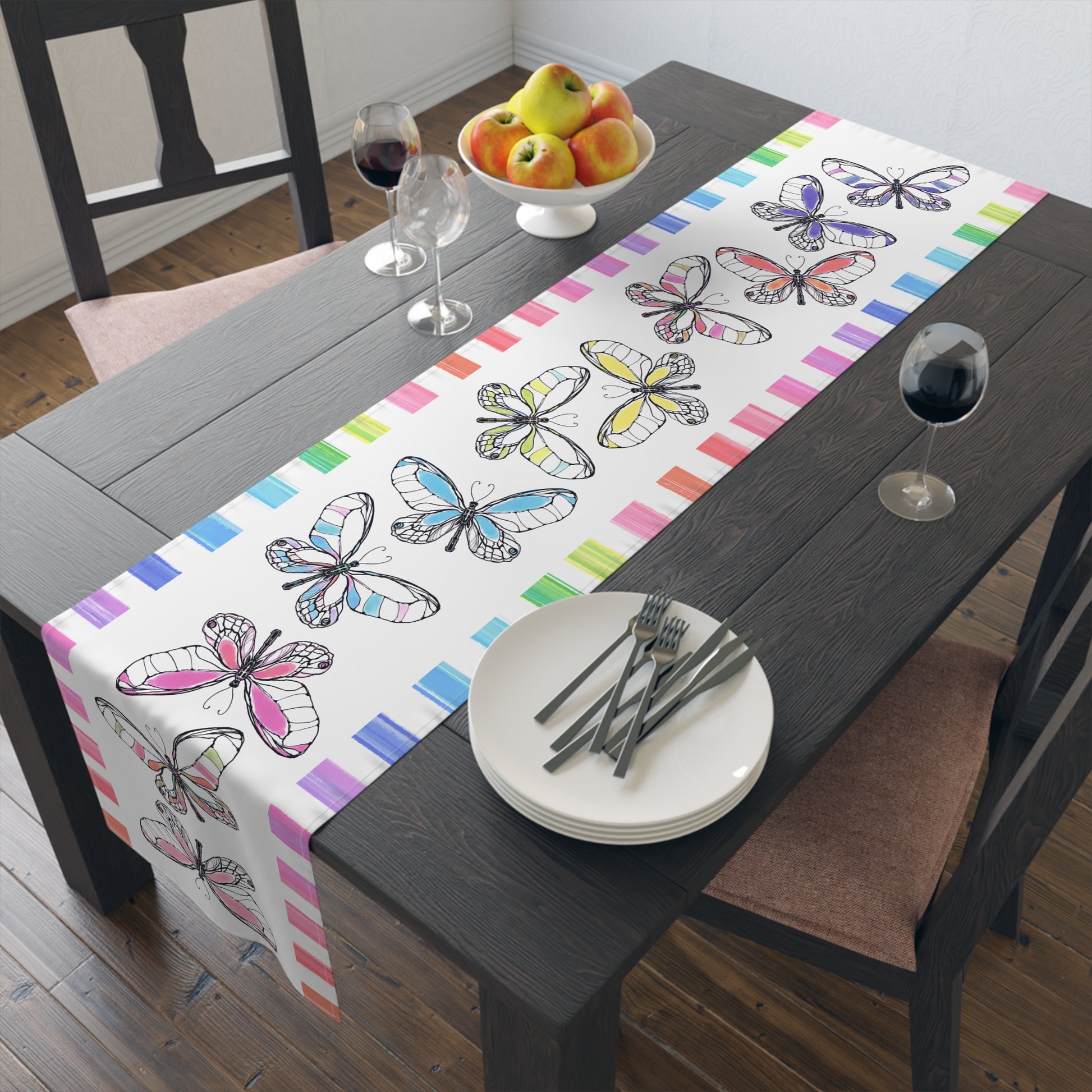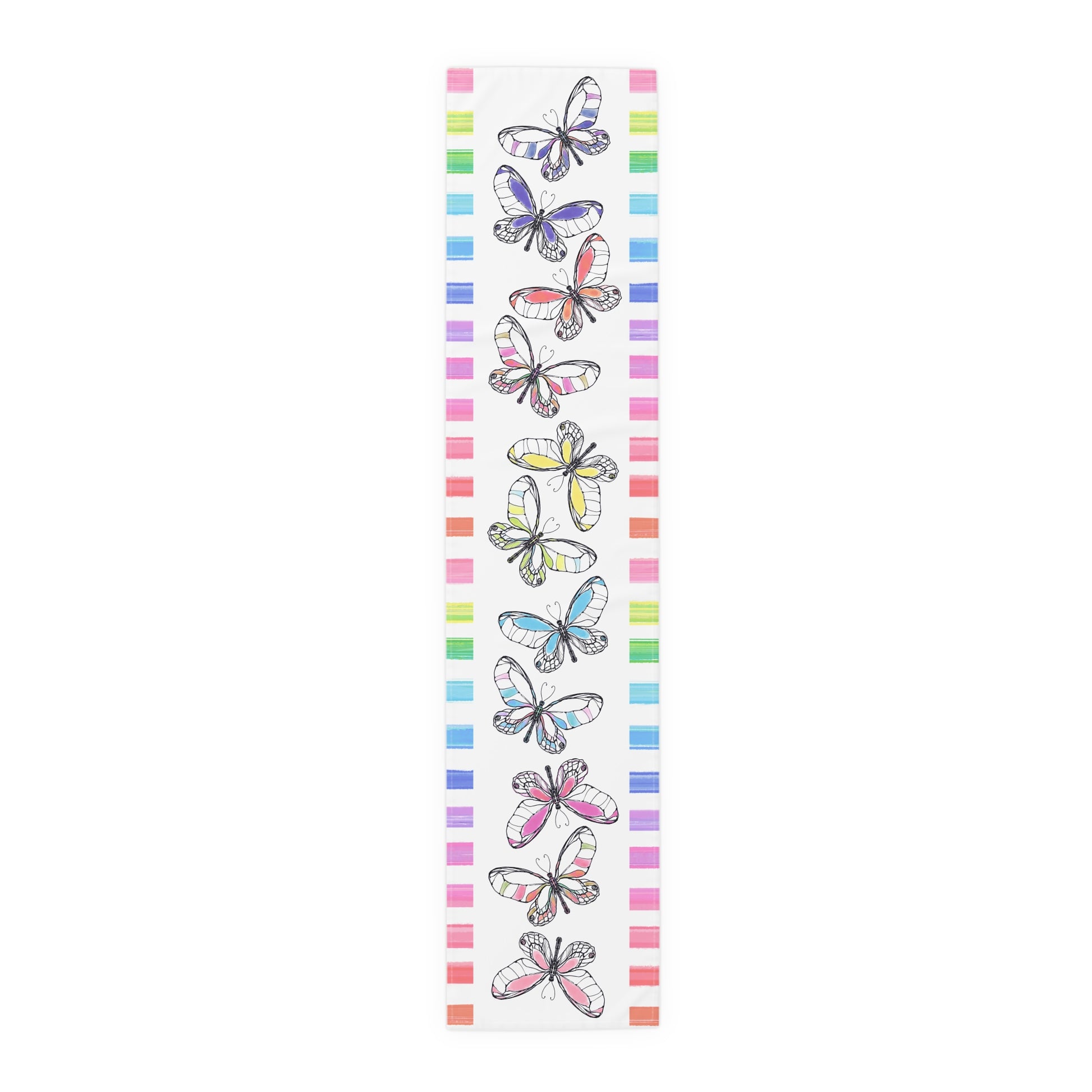 Butterfly Flutterstripe Table Runner in Multi-color with Checked Border 1 size ( 16" Γ 72") available in Cotton "creamier" & Polyester "whiter"