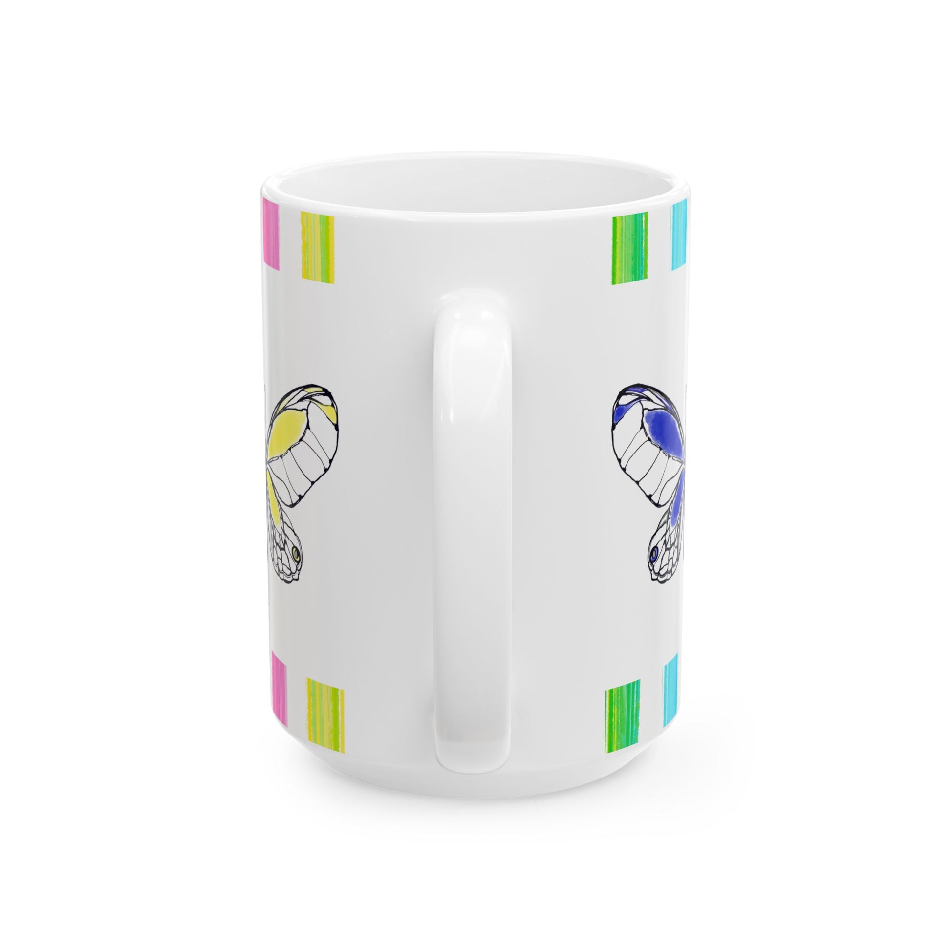 Butterfly Rainbow Stripe Ceramic Mug in Blue, Pink, and Yellow with Multi-color Striped Border, (Available in 2 sizes 11oz and 15oz)