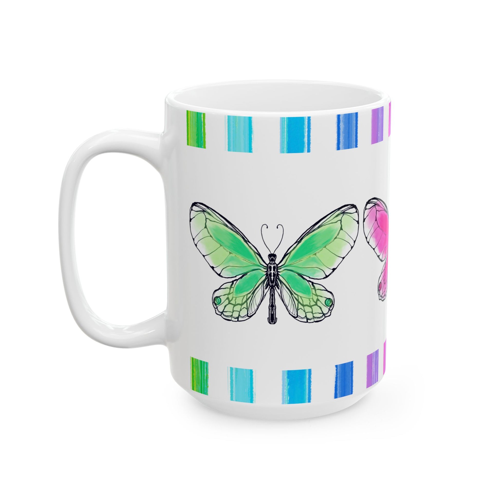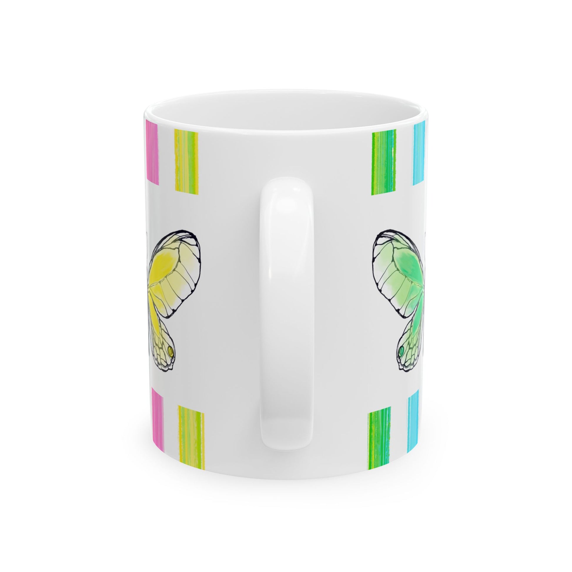 Butterfly Rainbow Stripe Ceramic Mug in Pink, Yellow, and Green with Multi-color Striped Border, (Available in 2 sizes 11oz and 15oz)