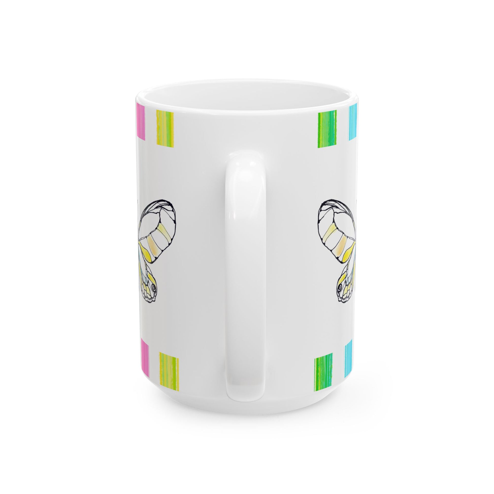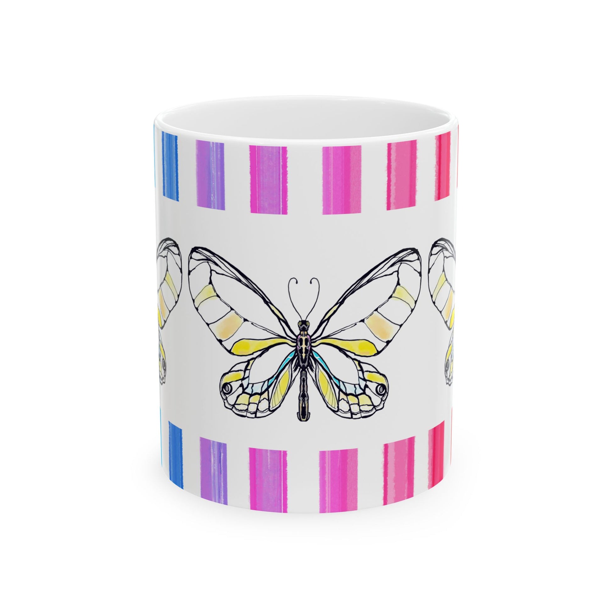 Butterfly Rainbow Stripe Ceramic Mug in Yellow with Multi-color Striped Border, (Available in 2 sizes 11oz and 15oz)