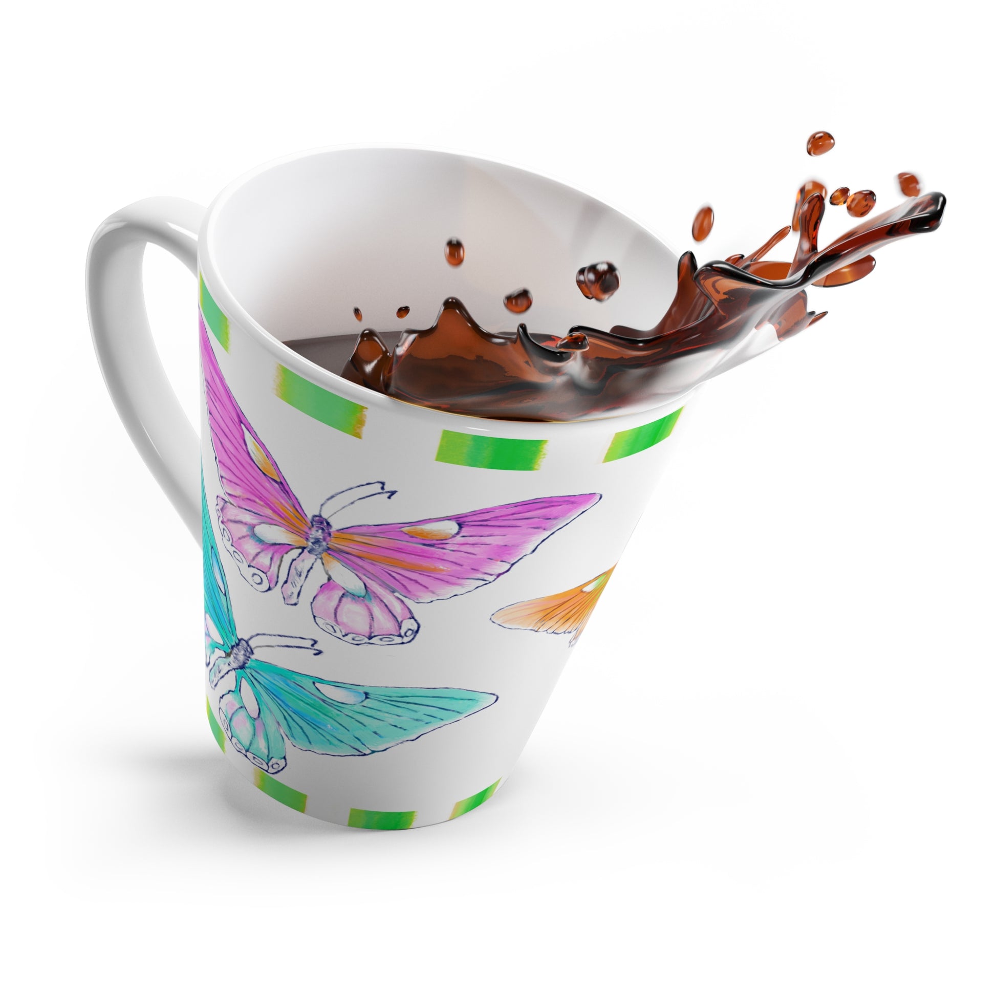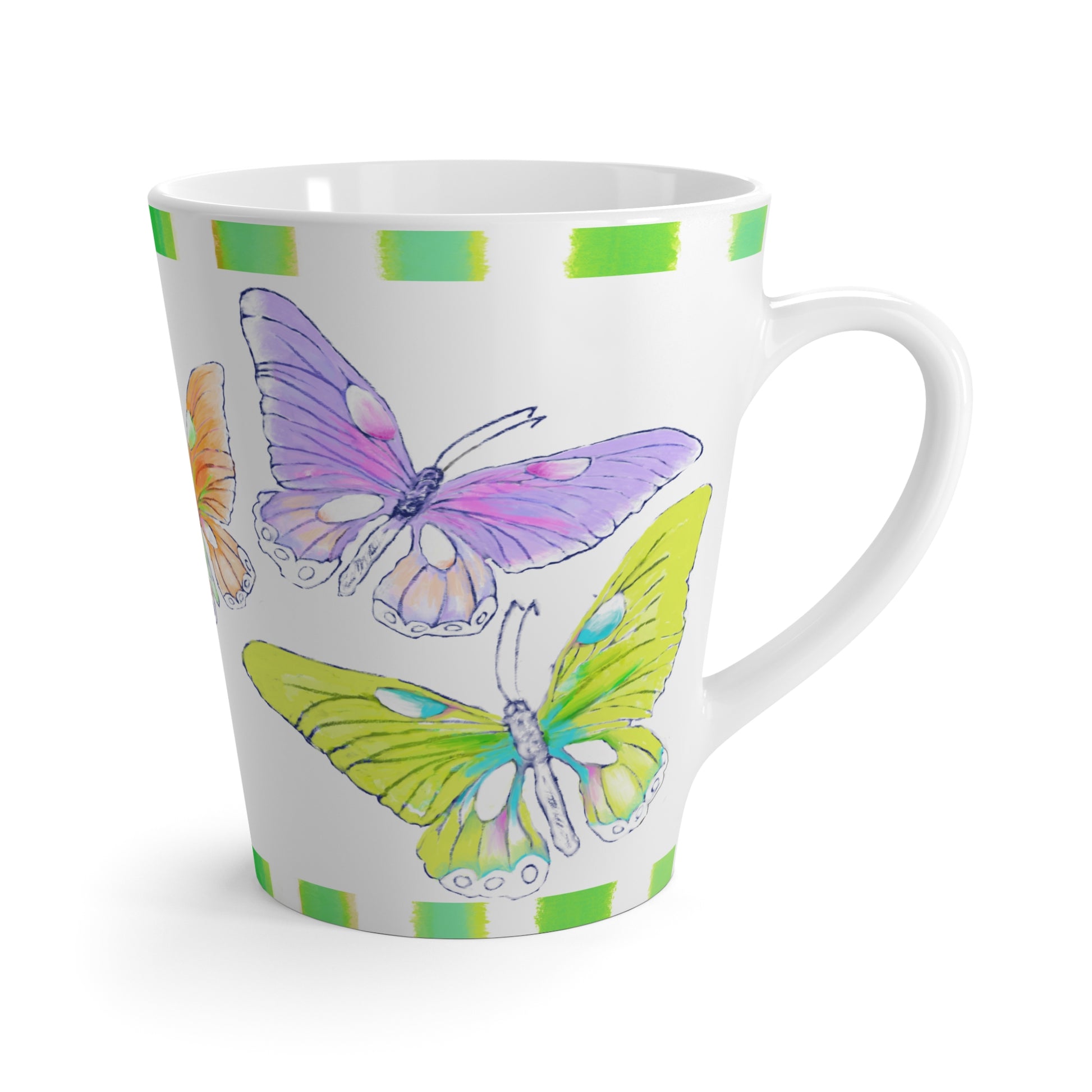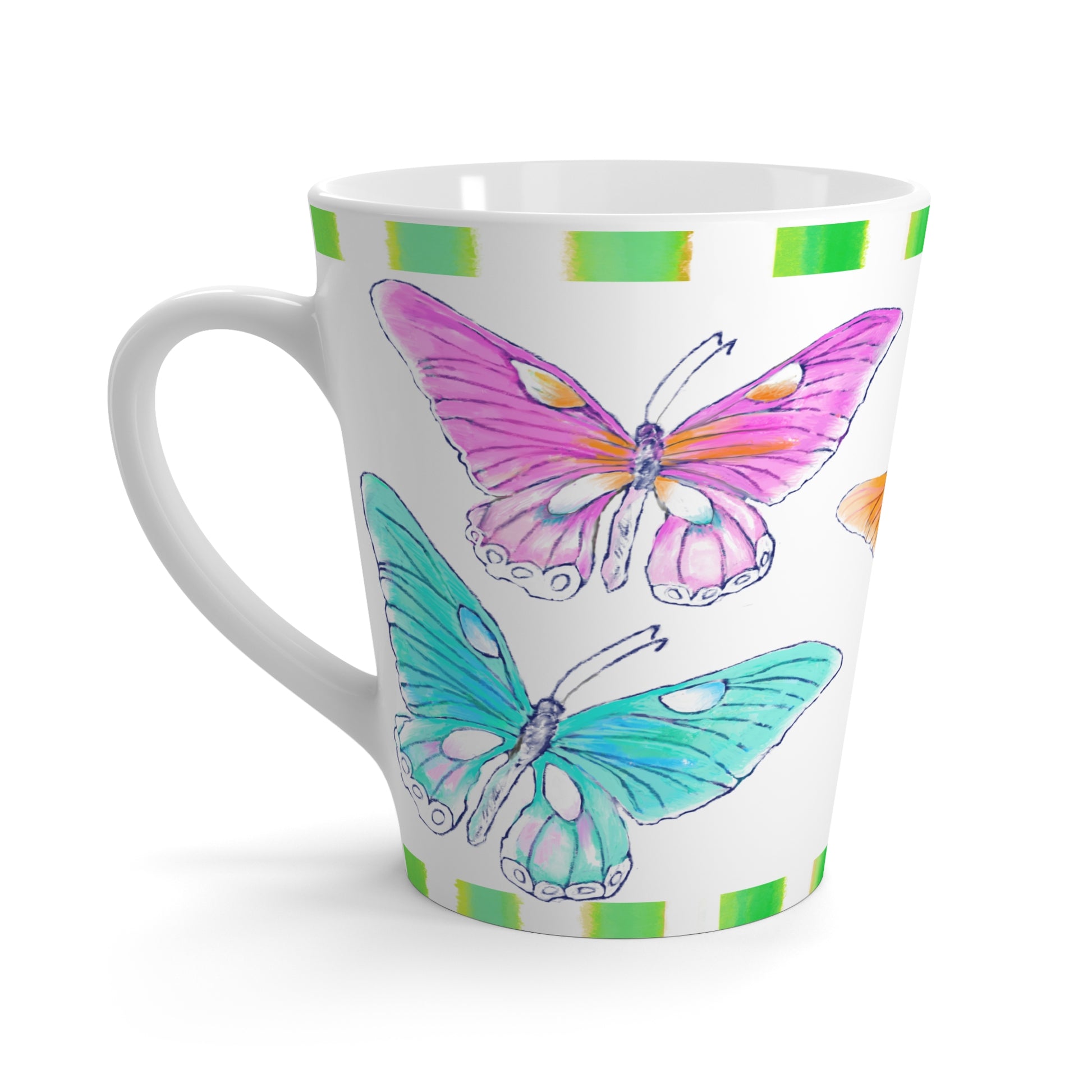 Butterfly Swing Latte Mug, Aqua, Lilac ,Orange, Yellow, Pink Butterflies, Green Stripe