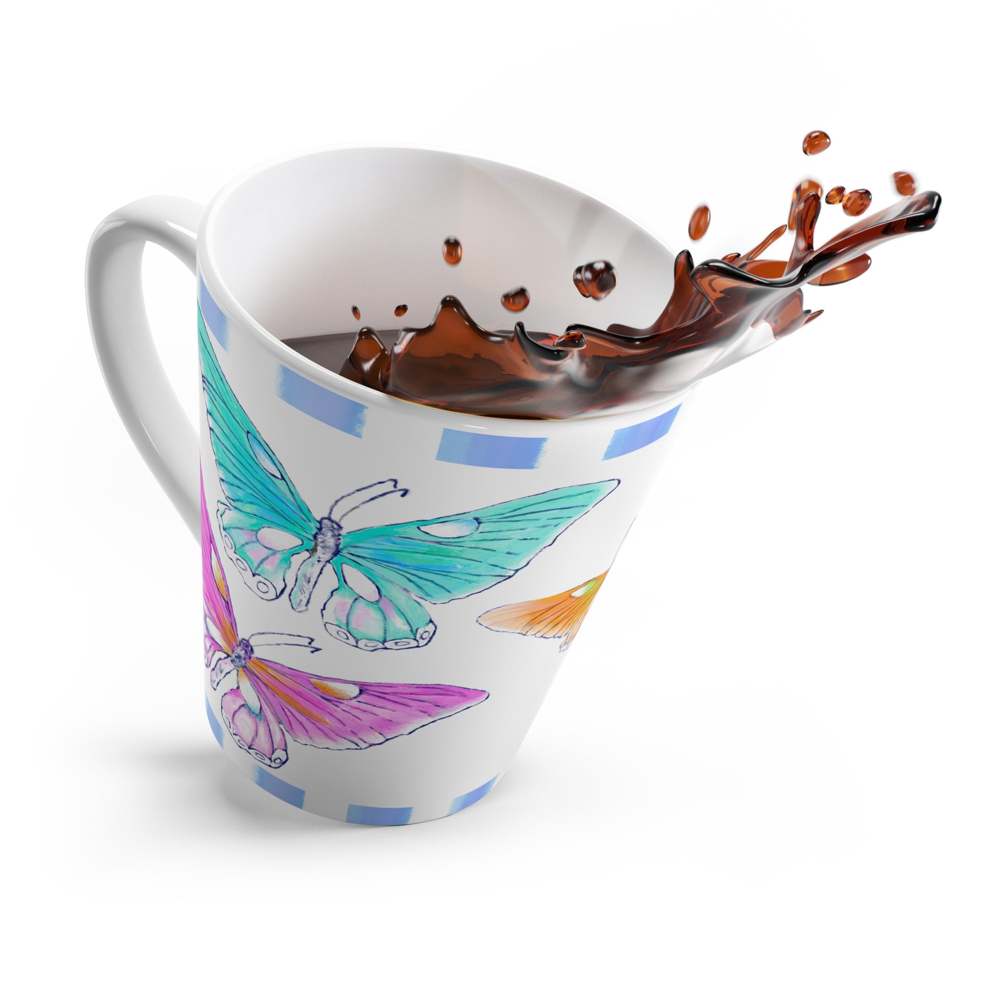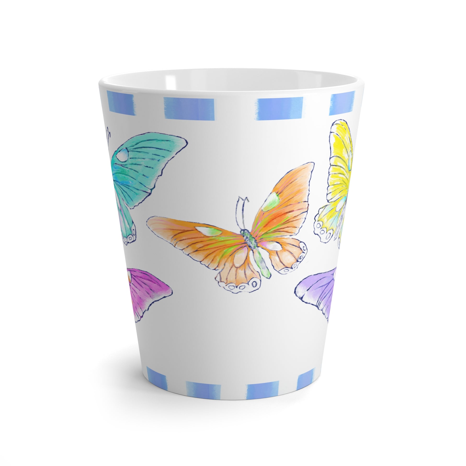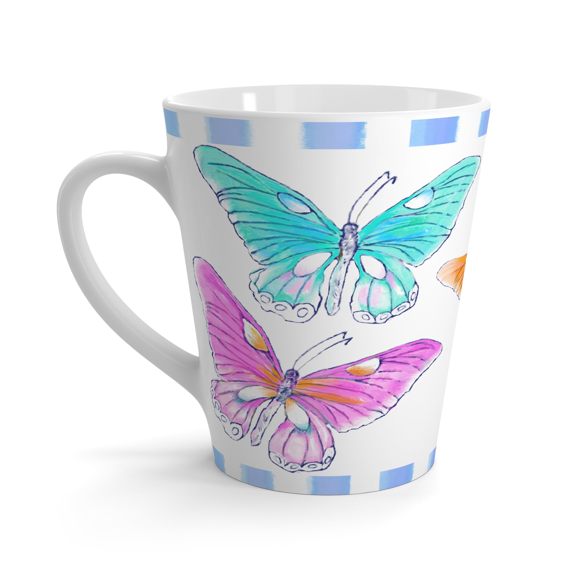 Butterfly Swing Latte Mug Aqua, Lilac, Pink , Orange, Yellow Butterflies, Blue Stripe
