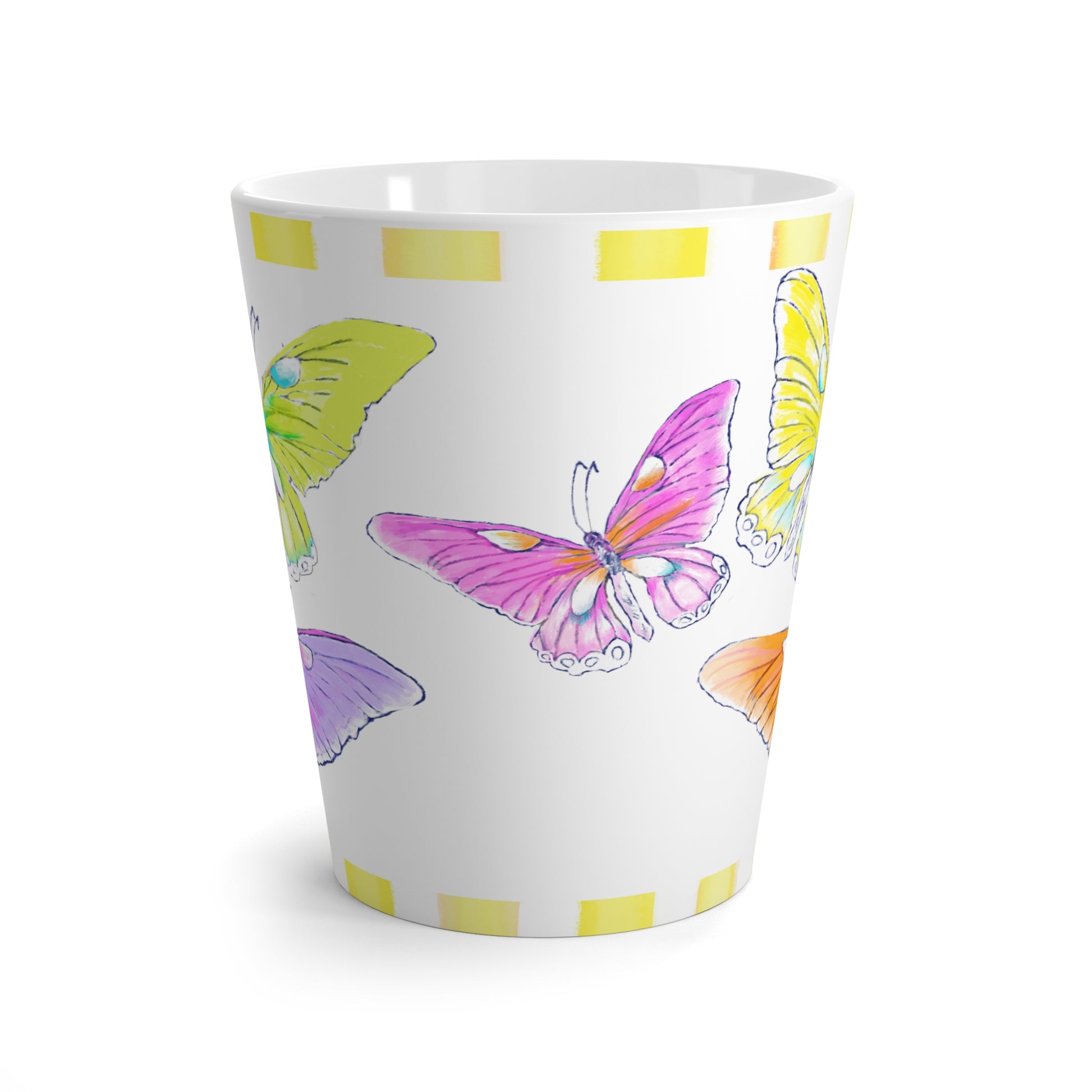 Butterfly Swing Latte Mug Aqua, Pink, Lilac. Orange, Yellow Butterflies, Yellow Stripe