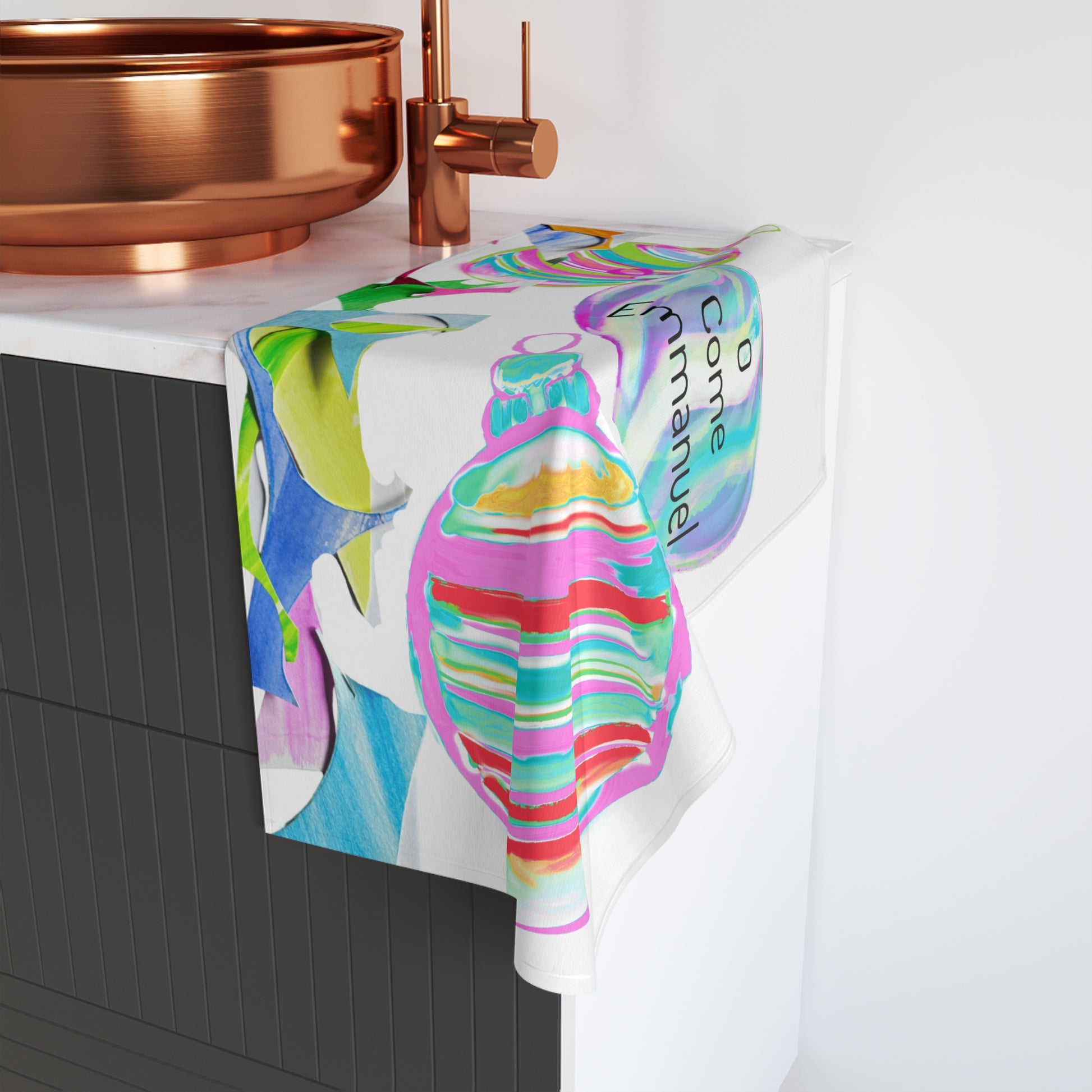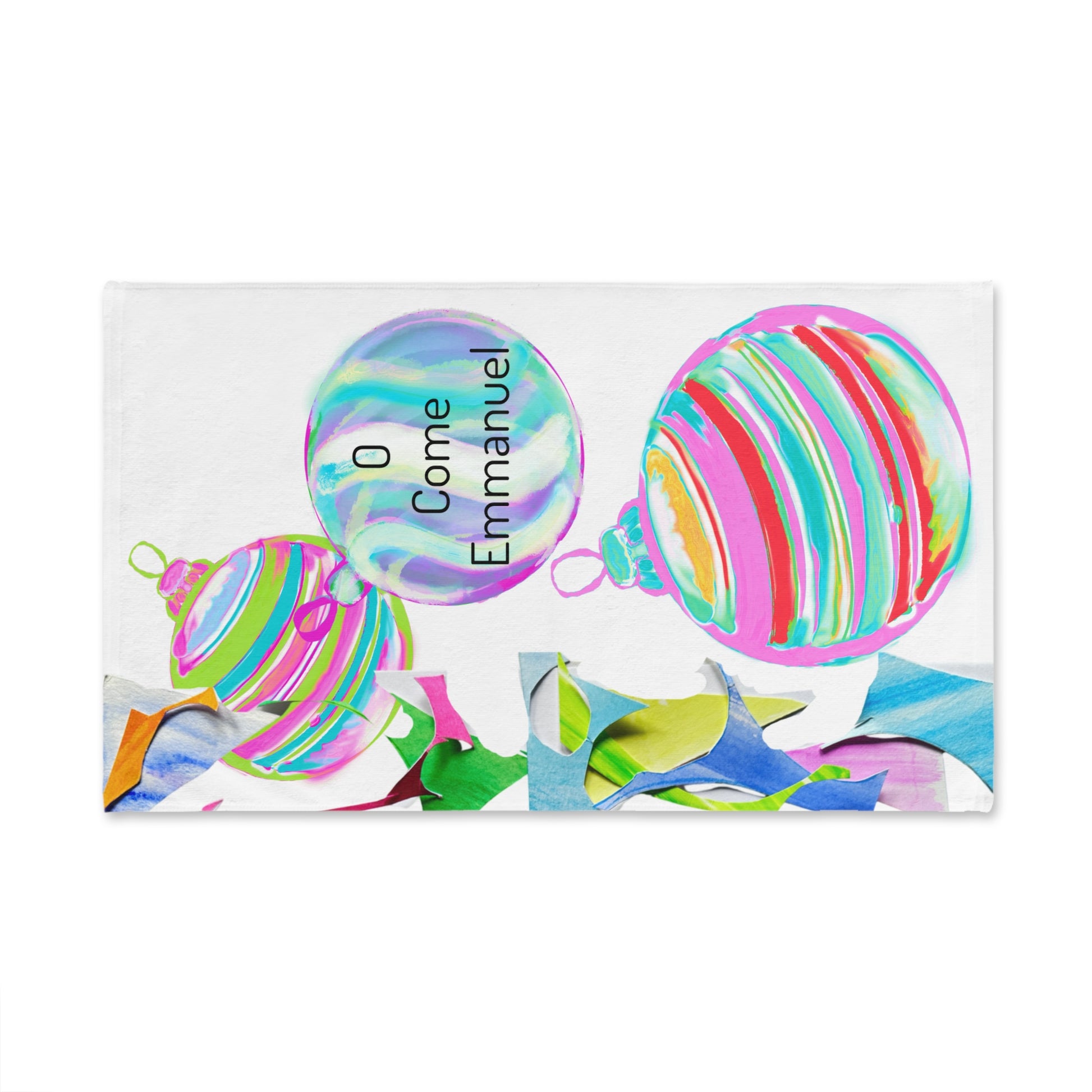 Celebrate the season with this cheerful Christmas hand towel, featuring hand-drawn ornaments in bright, joyful colors. Centered among the festive designs is the inspiring quote “O Come, O Come Emmanuel”, bringing holiday hope and warmth to your kitchen or bathroom. Soft, light, and durable, this towel adds both function and festive cheer to your daily routine.