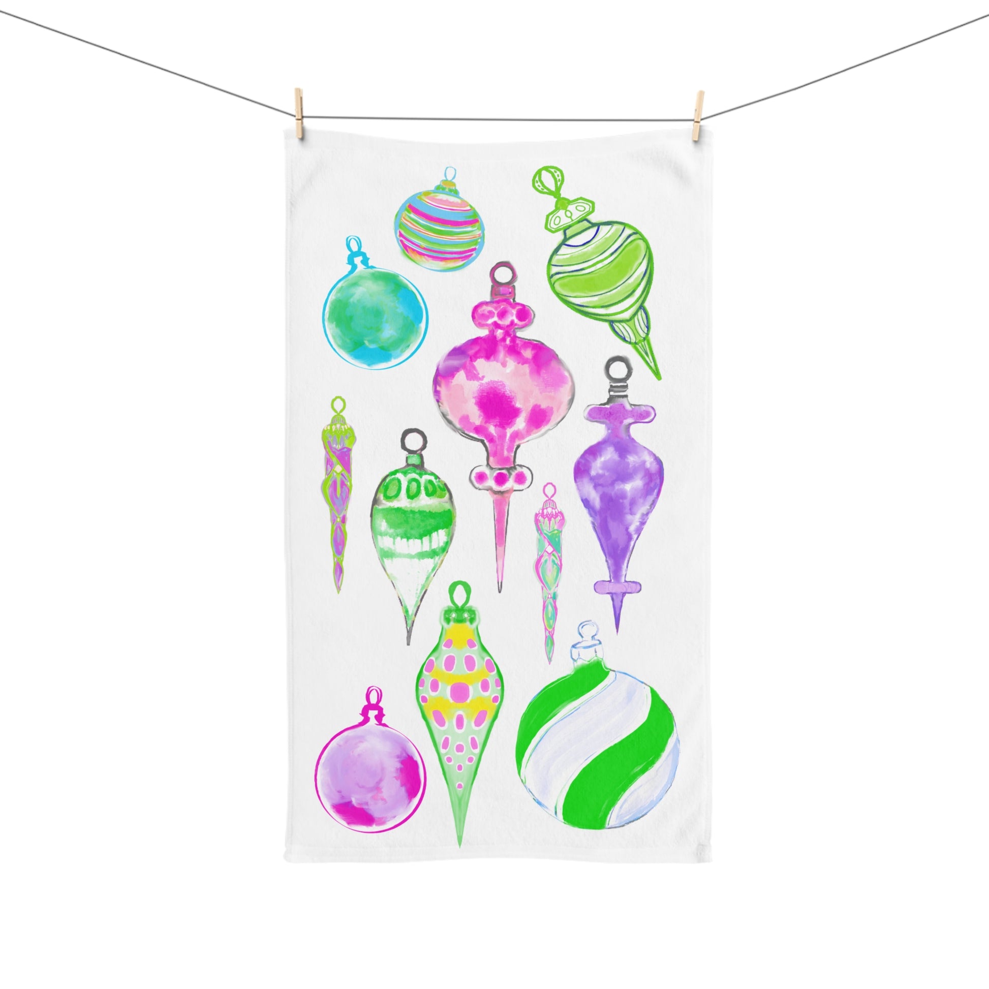 Bring holiday cheer to your kitchen or bathroom with this hand-drawn by Joel Borst for Periwinkles Design, featuring joyfully painted watercolor ornaments. Each vibrant ornament dances across the fabric, filling your space with festive color and seasonal delight. Soft, lightweight, and durable, this towel blends function with playful holiday charm. Great for art in the kitchen or bathroom or powder room