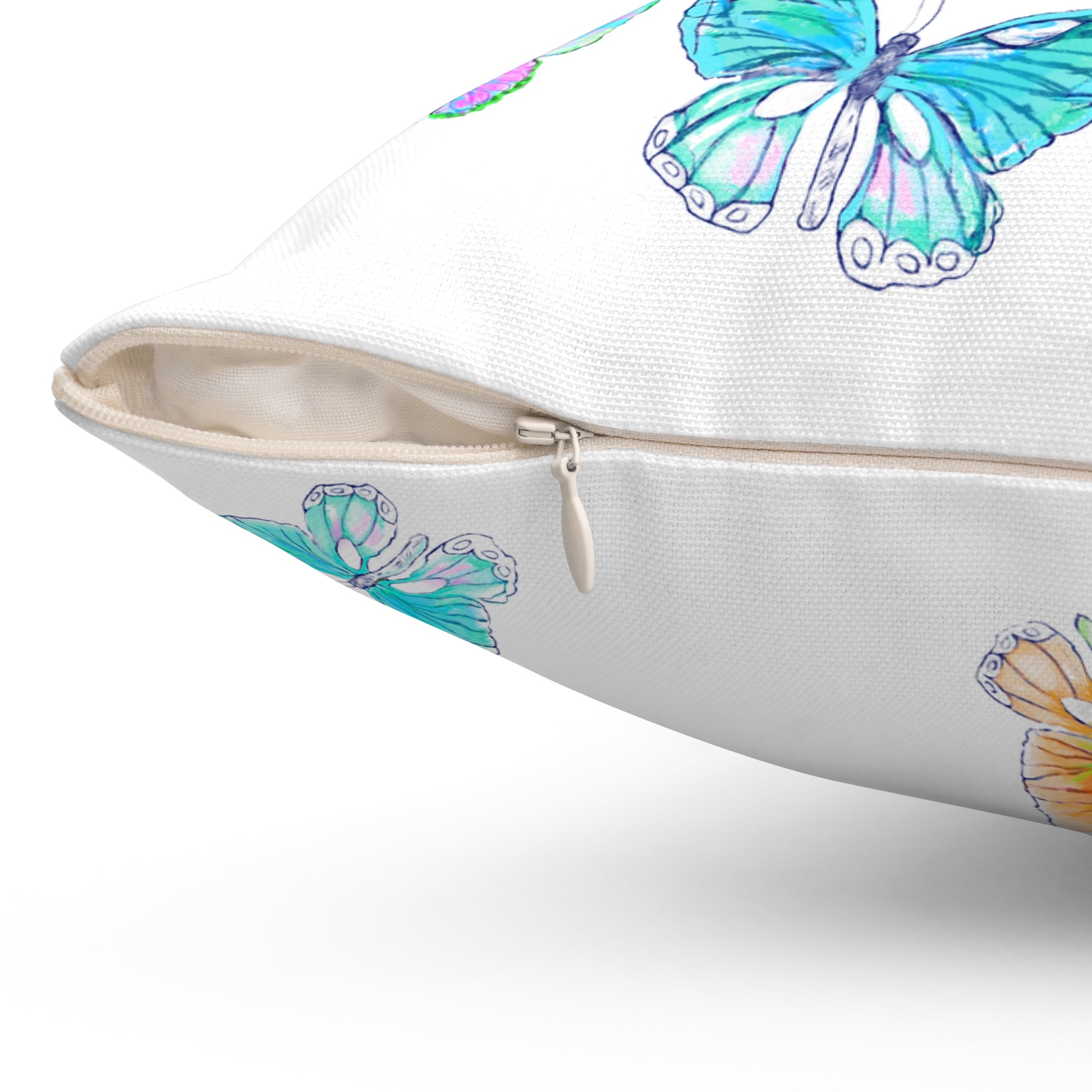Dancing Tulips Butterflies Spun Polyester Square Pillow. Multi-Color Butterflies, Pink Tulip