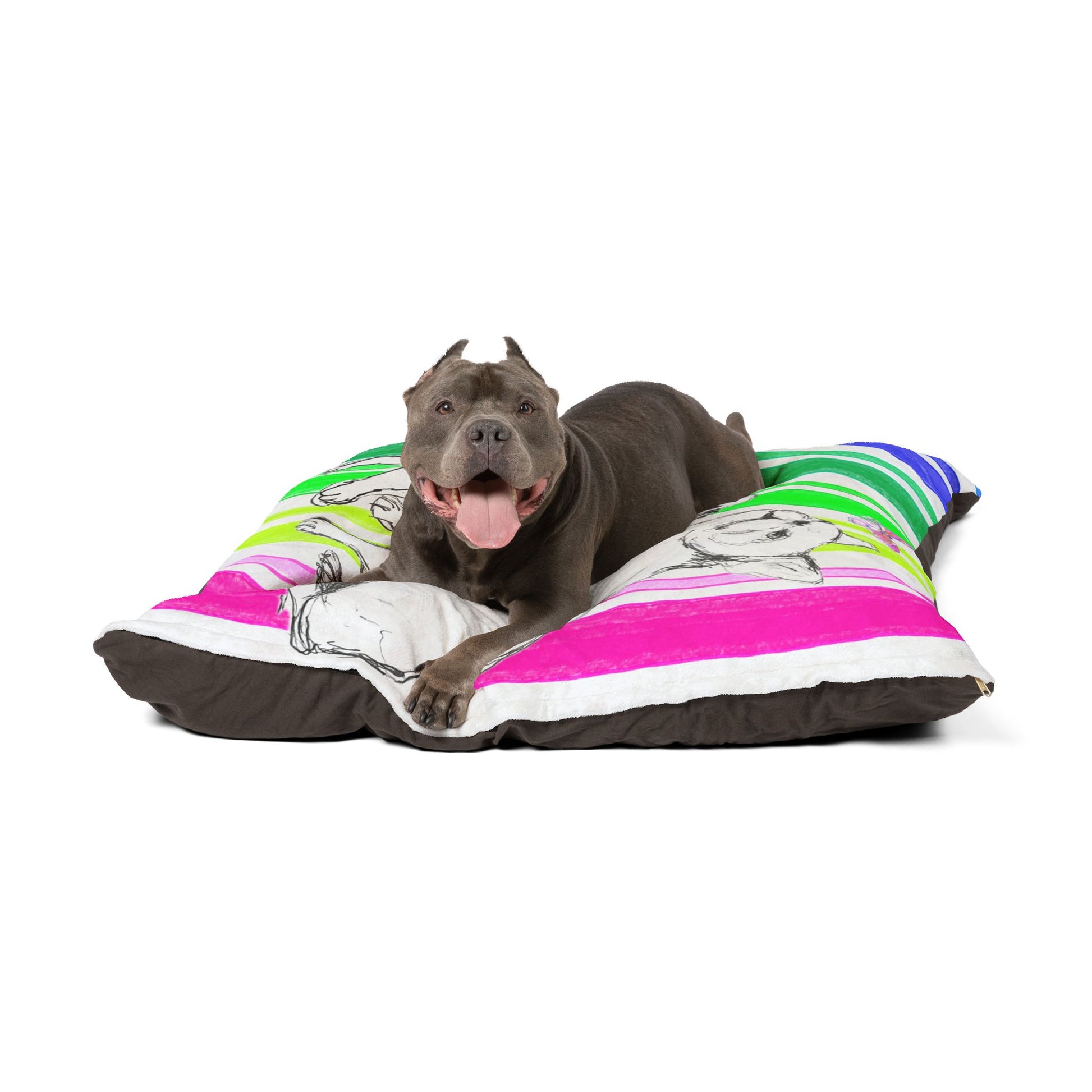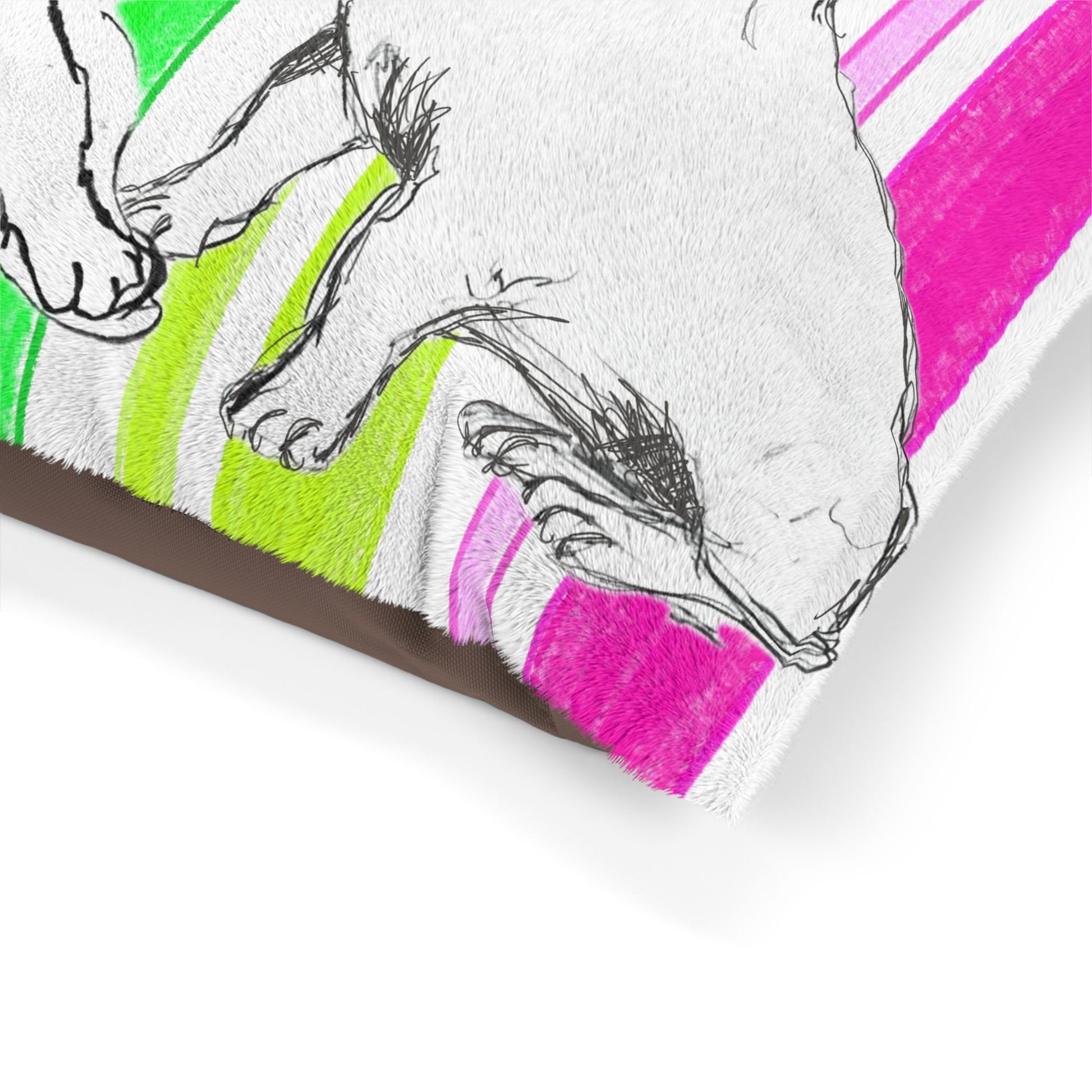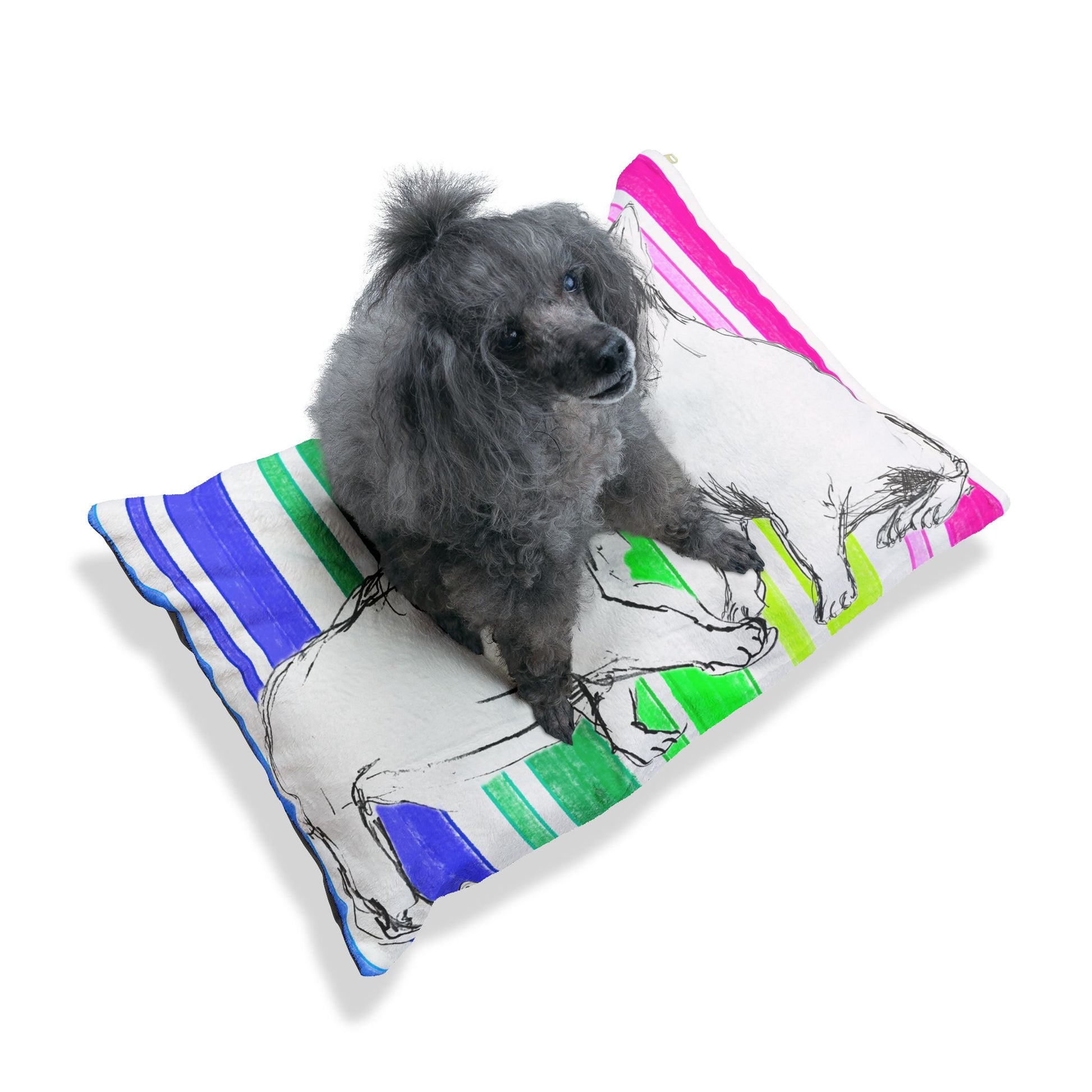 With a feather-soft fleece top featuring Hand painted Watercolor stripes in a rainbow of color and Laurie Hoogland's lovable furry friends, this artistic pet bed is a whimsical nest for your roving home security system. Whether placed by your feet, near a sunny window, or in the heart of your home, this bed is more than just comfort—it’s a beautiful accent piece that brings joy to any room. What a fun bed for a doggie sleepover party