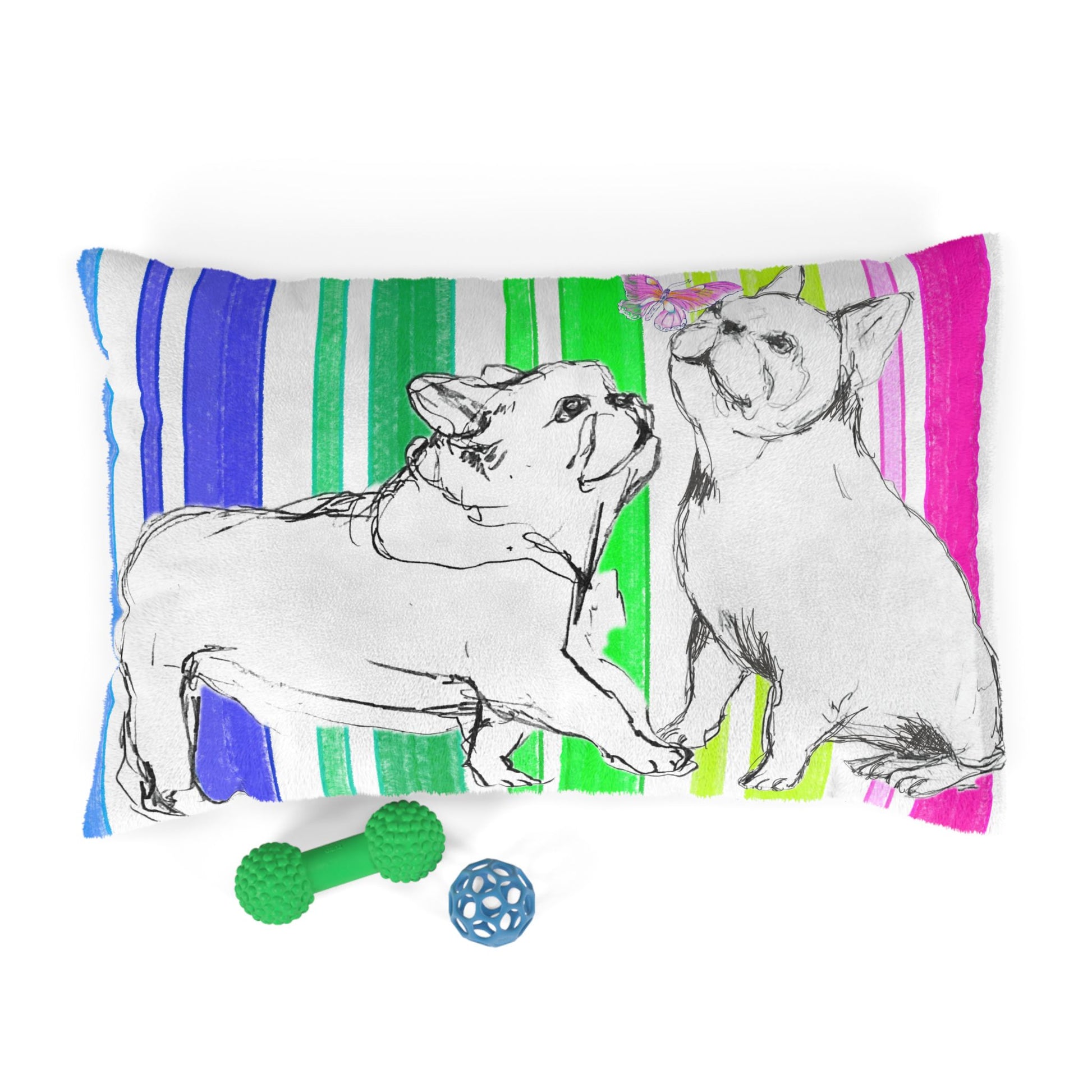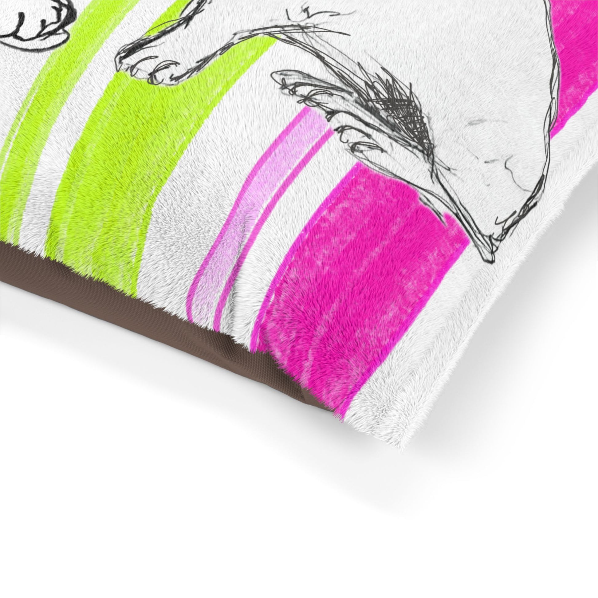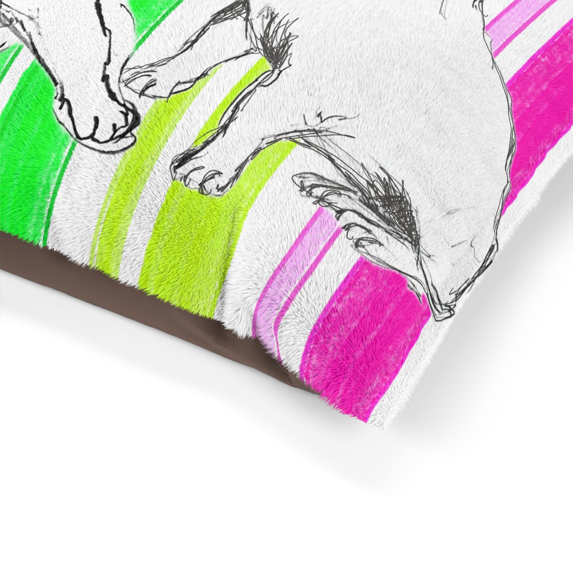 With a feather-soft fleece top featuring Hand painted Watercolor stripes in a rainbow of color and Laurie Hoogland's lovable furry friends, this artistic pet bed is a whimsical nest for your roving home security system. Whether placed by your feet, near a sunny window, or in the heart of your home, this bed is more than just comfort—it’s a beautiful accent piece that brings joy to any room. What a fun bed for a doggie sleepover party