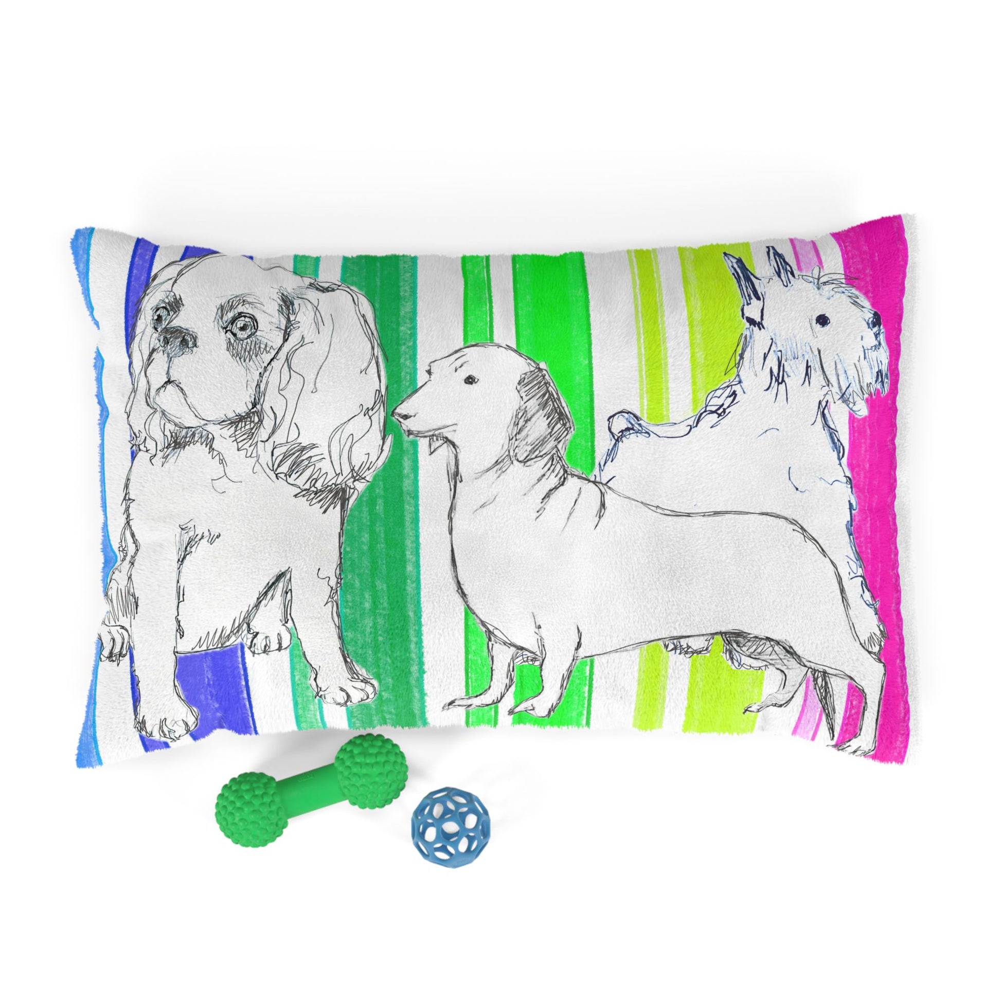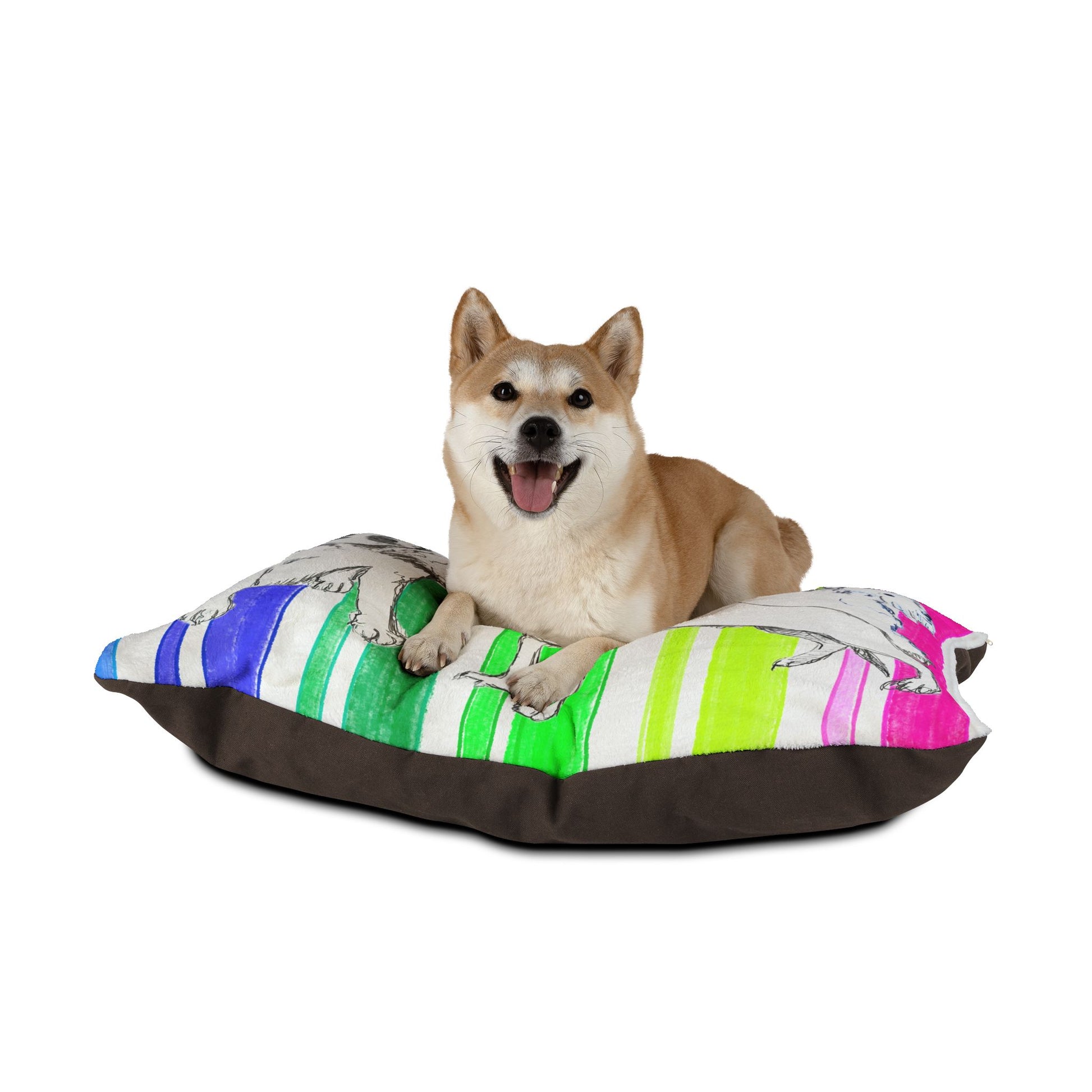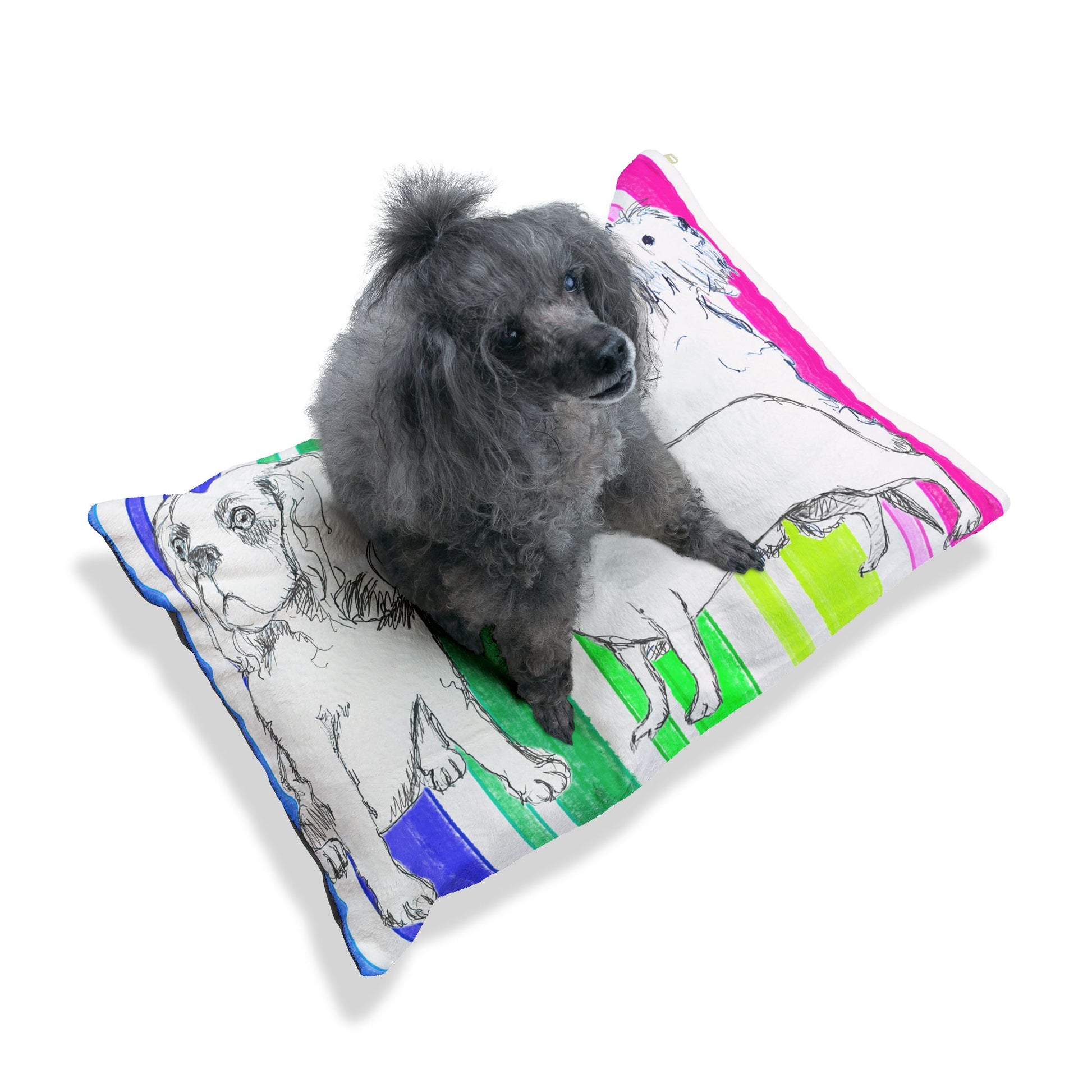 With a feather-soft fleece top featuring Hand painted Watercolor stripes in a rainbow of color and Laurie’s lovable furry friends, this artistic pet bed is a whimsical nest for your roving home security system. Whether placed by your feet, near a sunny window, or in the heart of your home, this bed is more than just comfort—it’s a beautiful accent piece that brings joy to any room. What a fun bed for a doggie sleepover party