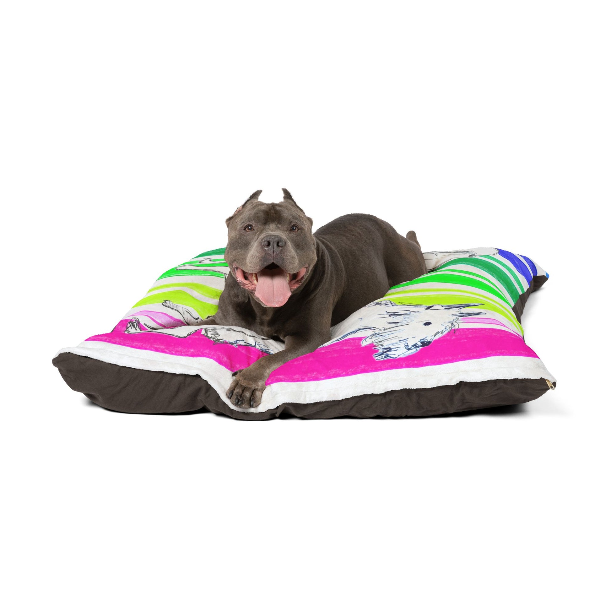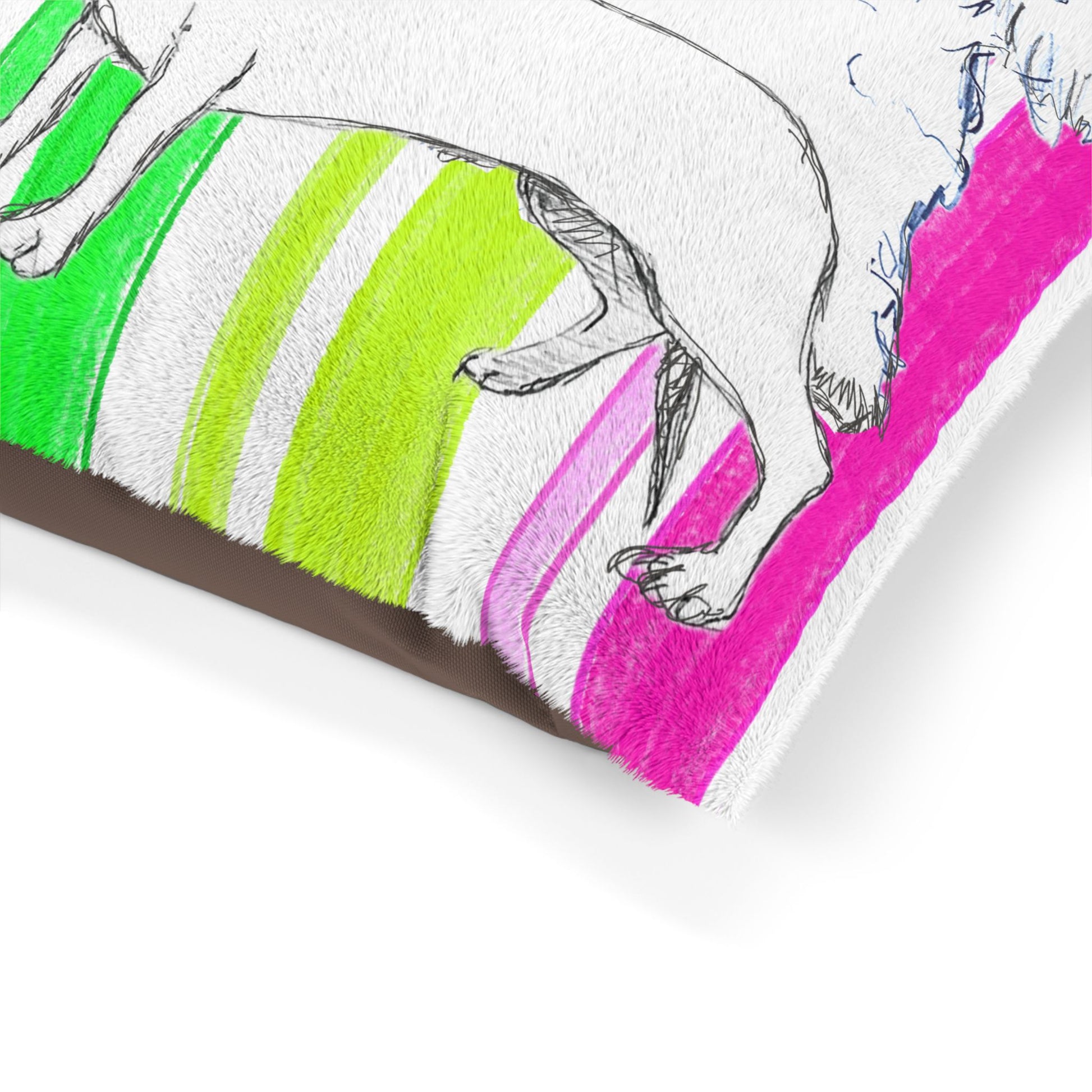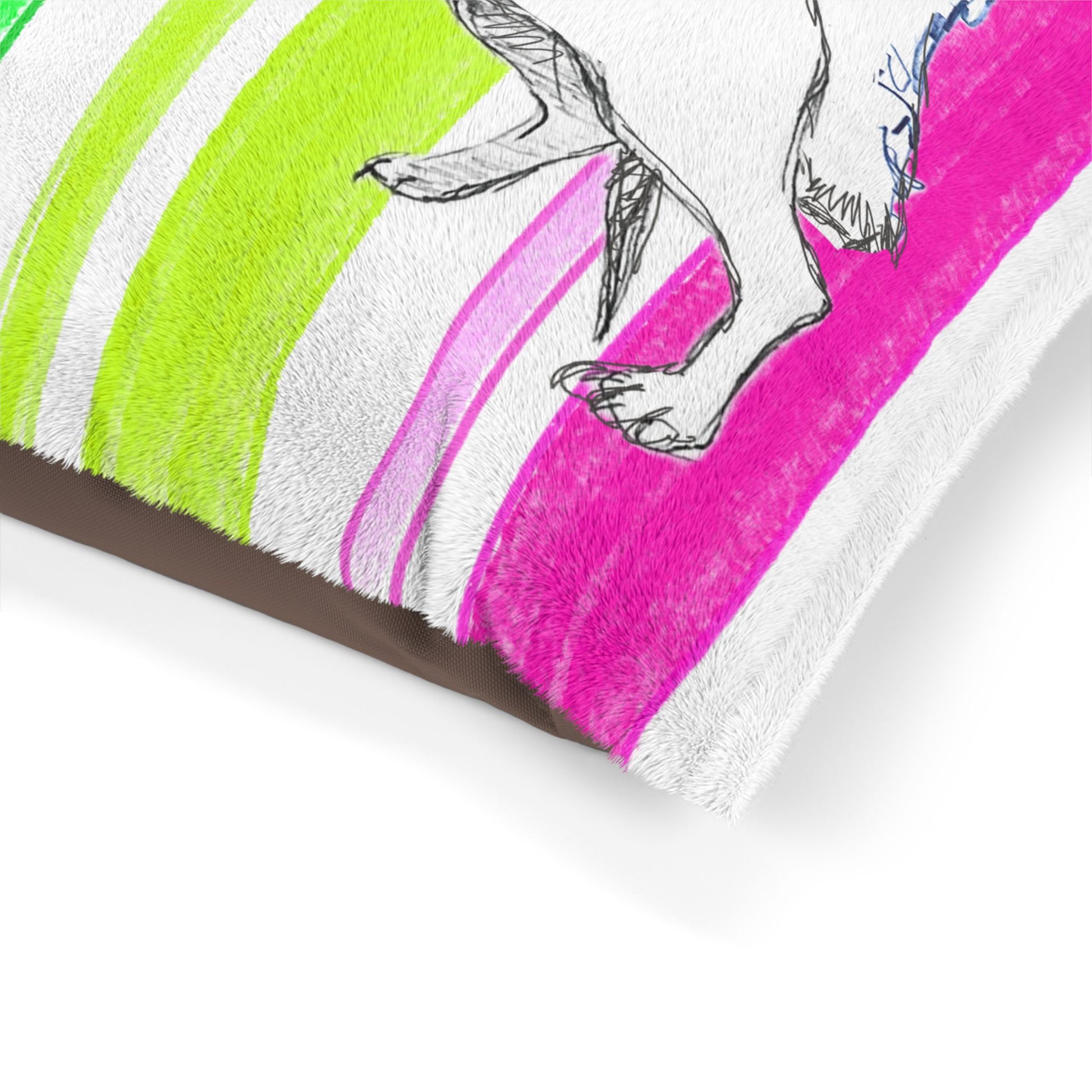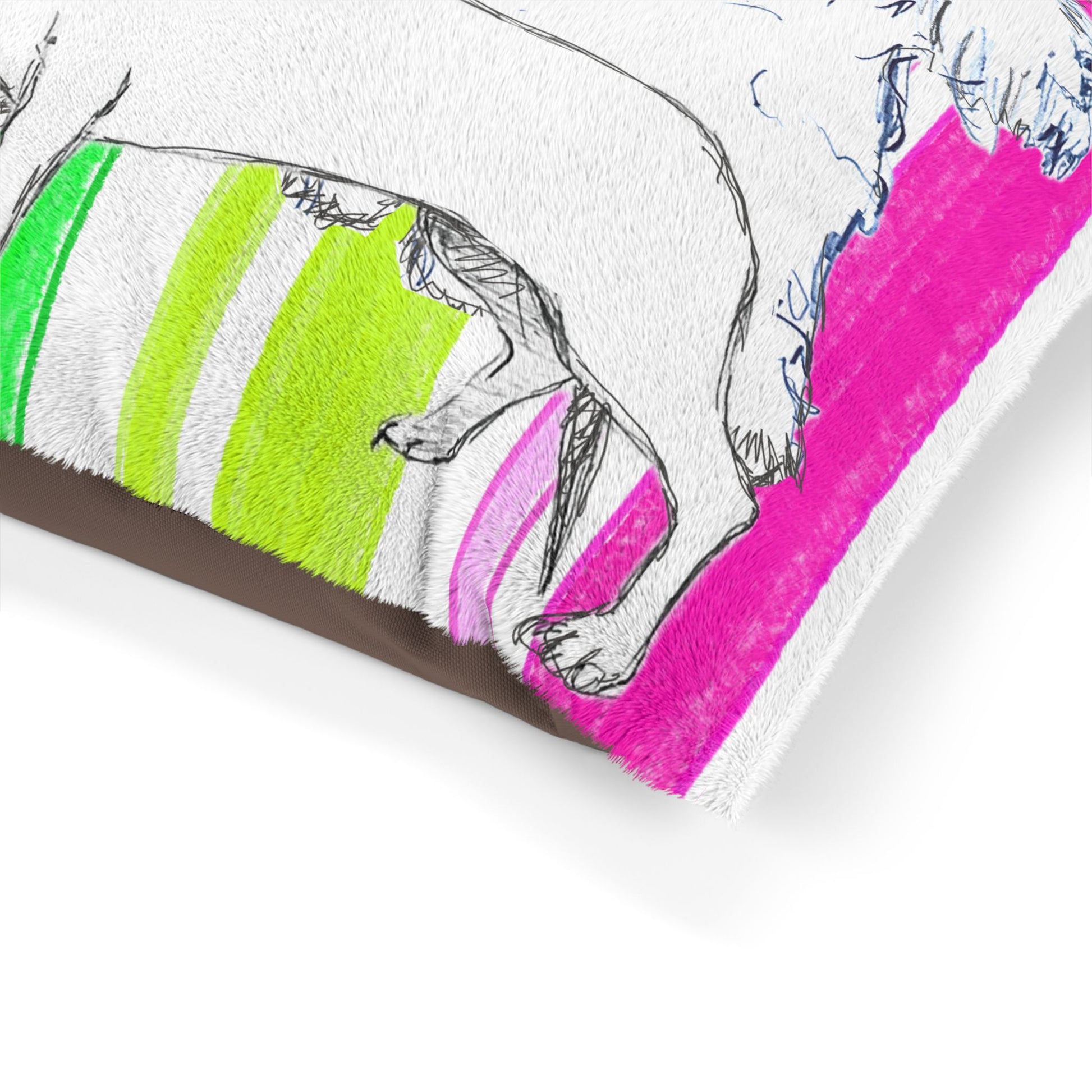 With a feather-soft fleece top featuring Hand painted Watercolor stripes in a rainbow of color and Laurie’s lovable furry friends, this artistic pet bed is a whimsical nest for your roving home security system. Whether placed by your feet, near a sunny window, or in the heart of your home, this bed is more than just comfort—it’s a beautiful accent piece that brings joy to any room. What a fun bed for a doggie sleepover party