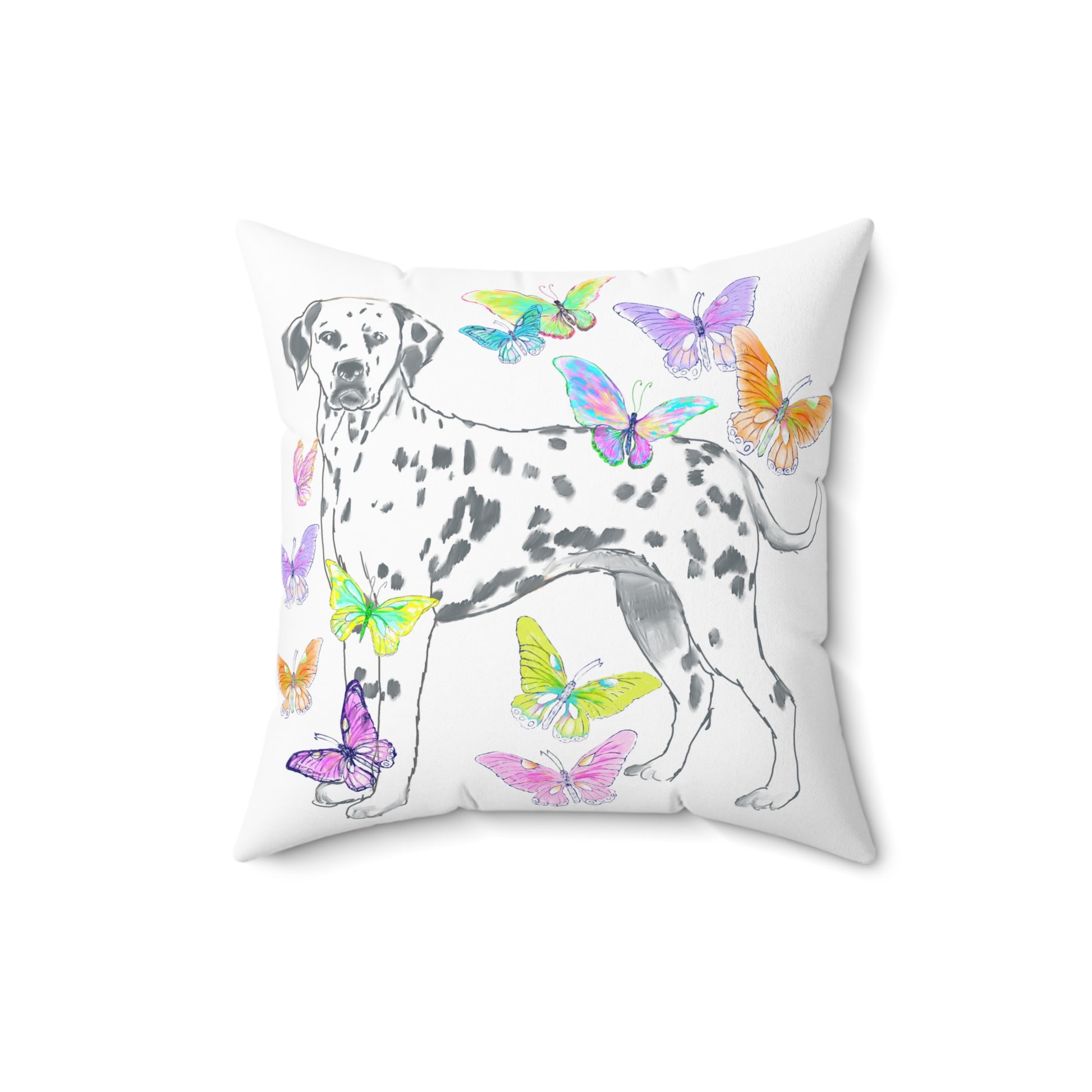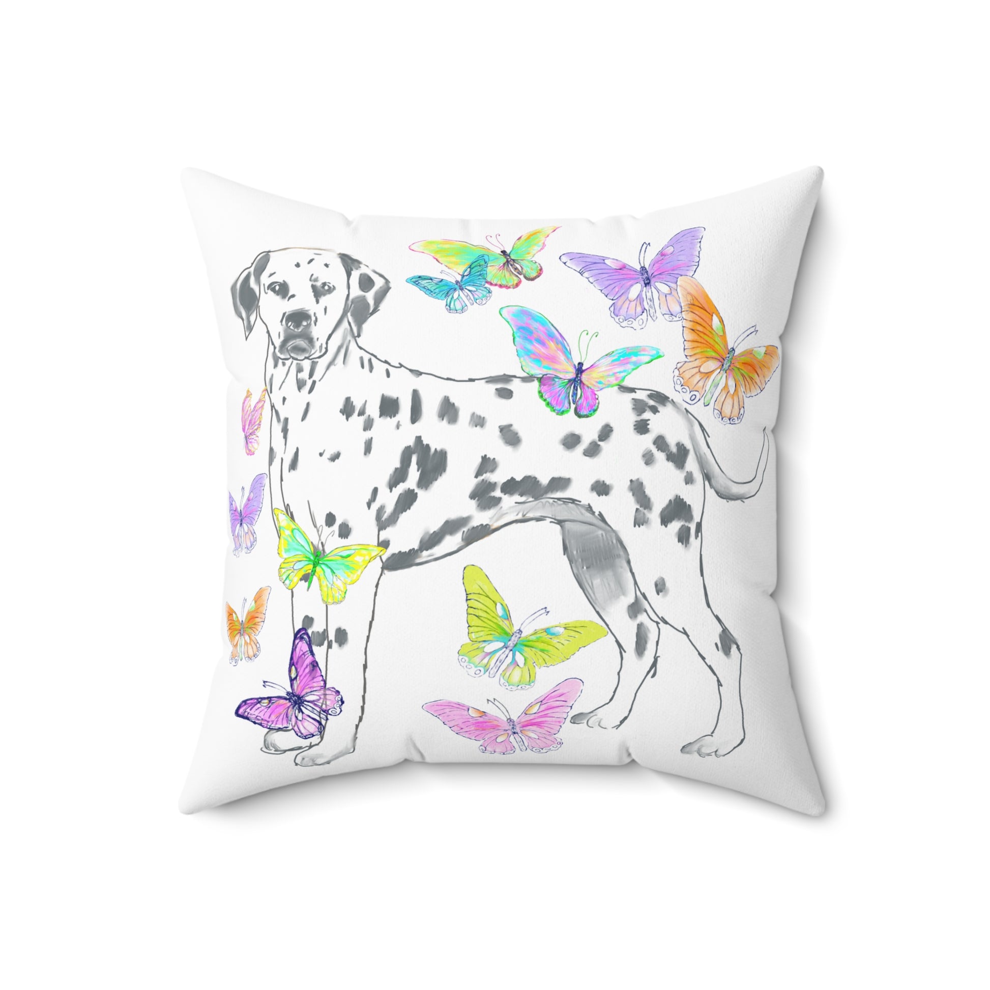 Room accents shouldn’t be underestimated—especially when they bring this much joy! This double-sided decorative pillow features two delightful hand-drawn scenes: a sweet doggie surrounded by color on one side and a fluttering flurry of vibrant butterflies on the other. Designed by a local artist who adores color, this pillow turns your sofa, bed, or reading nook into a playful and personal expression of mood and creativity.