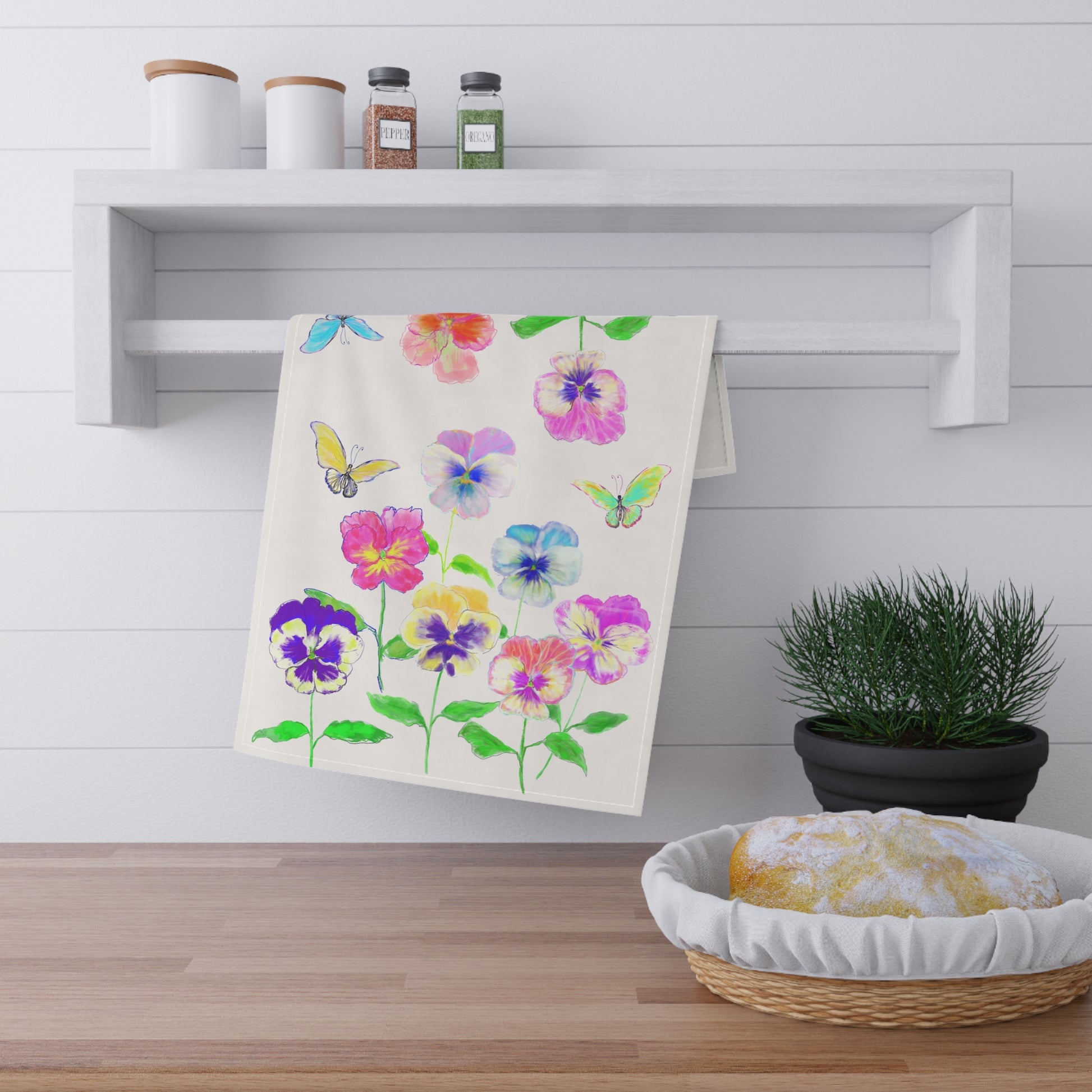 Brighten your kitchen with the “Pansy Parade” tea towel—a perfect blend of functionality and floral artistr