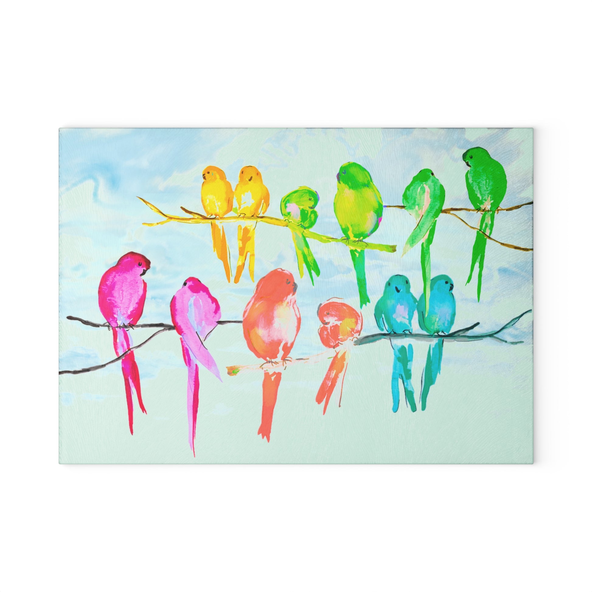 Bring song, color, and charm into your kitchen with this custom glass cutting board. Featuring Luke Borst’s Watercolor Birds on a Branch for Periwinkles, it captures a quiet moment of feathered friends perched together—reminding you that even everyday cooking can feel artful.