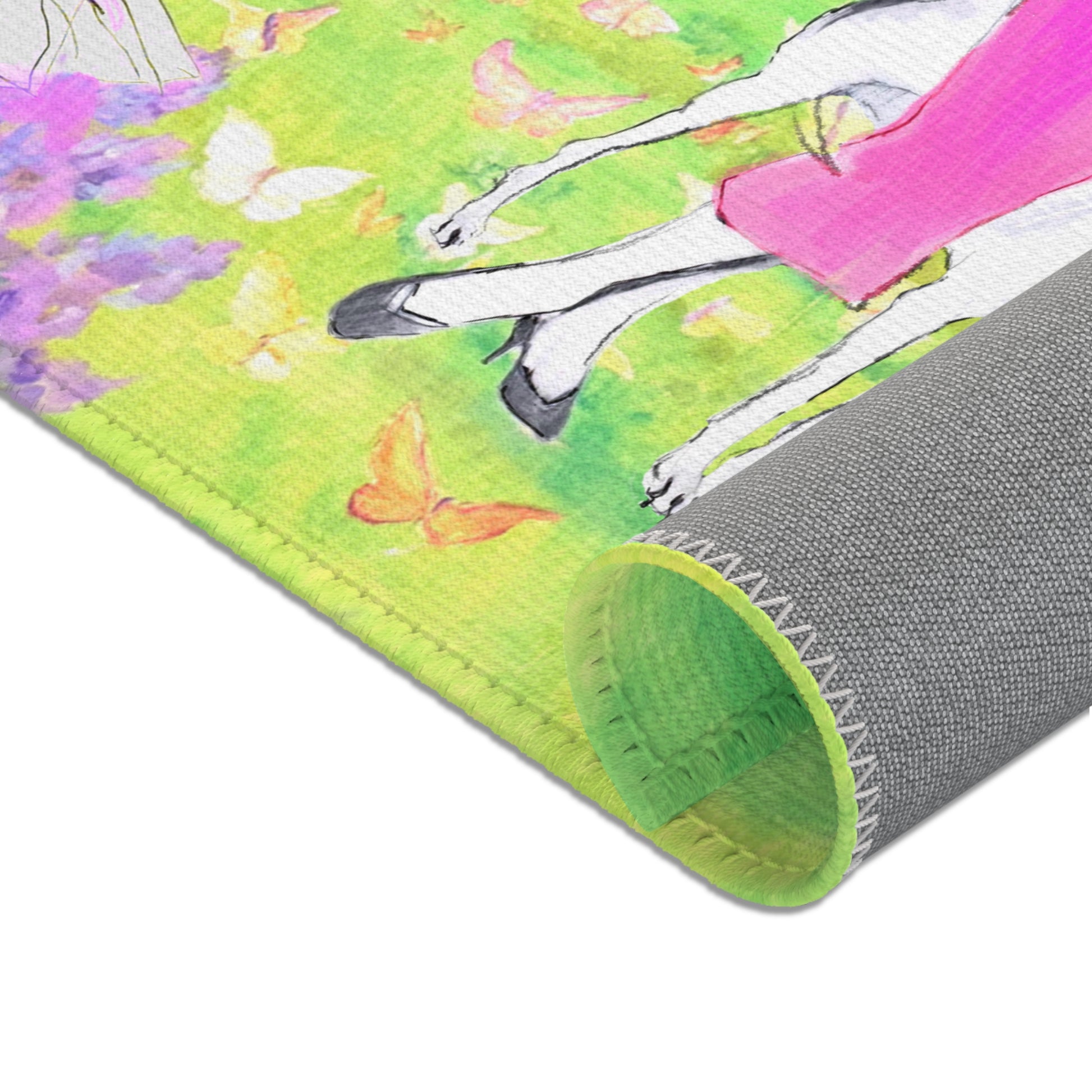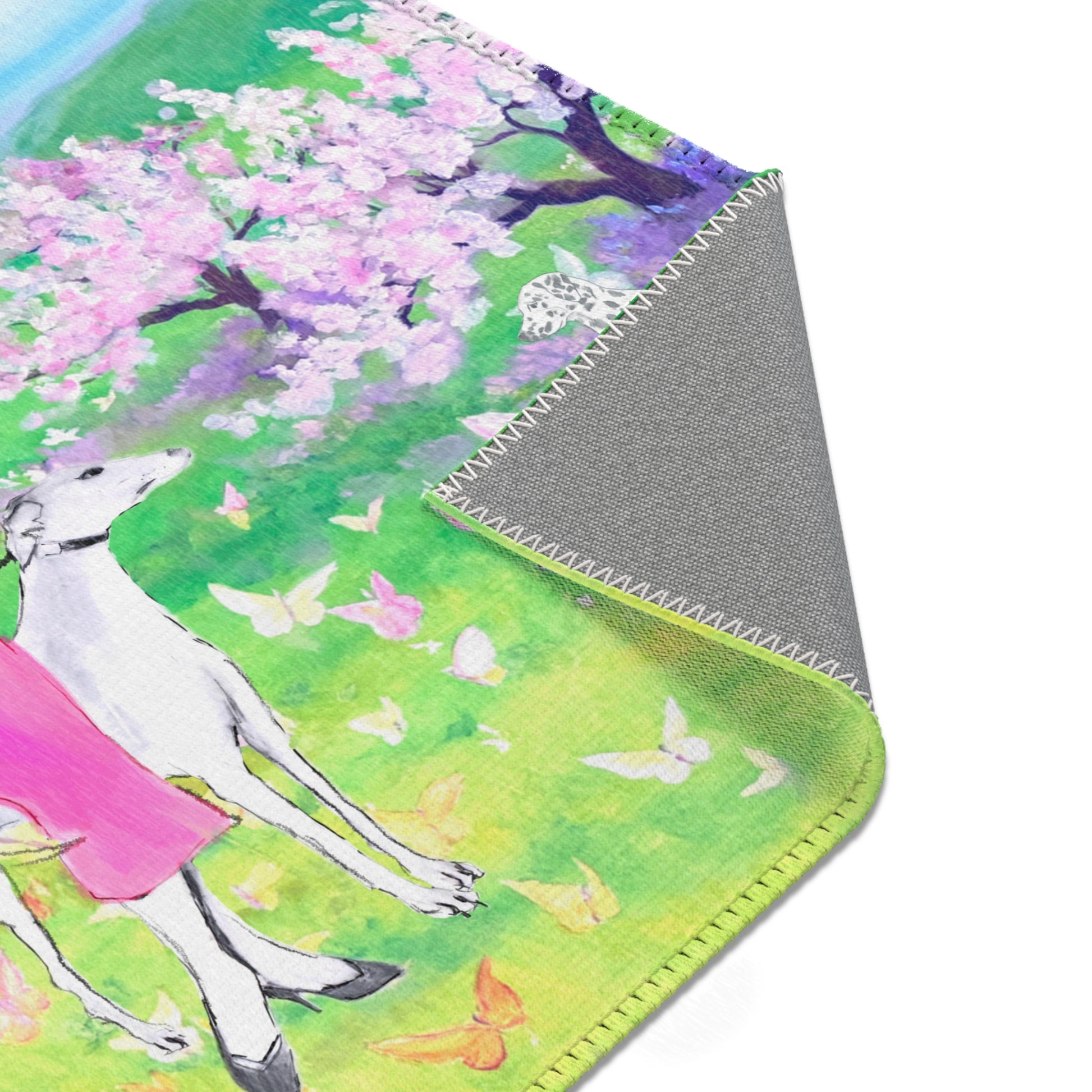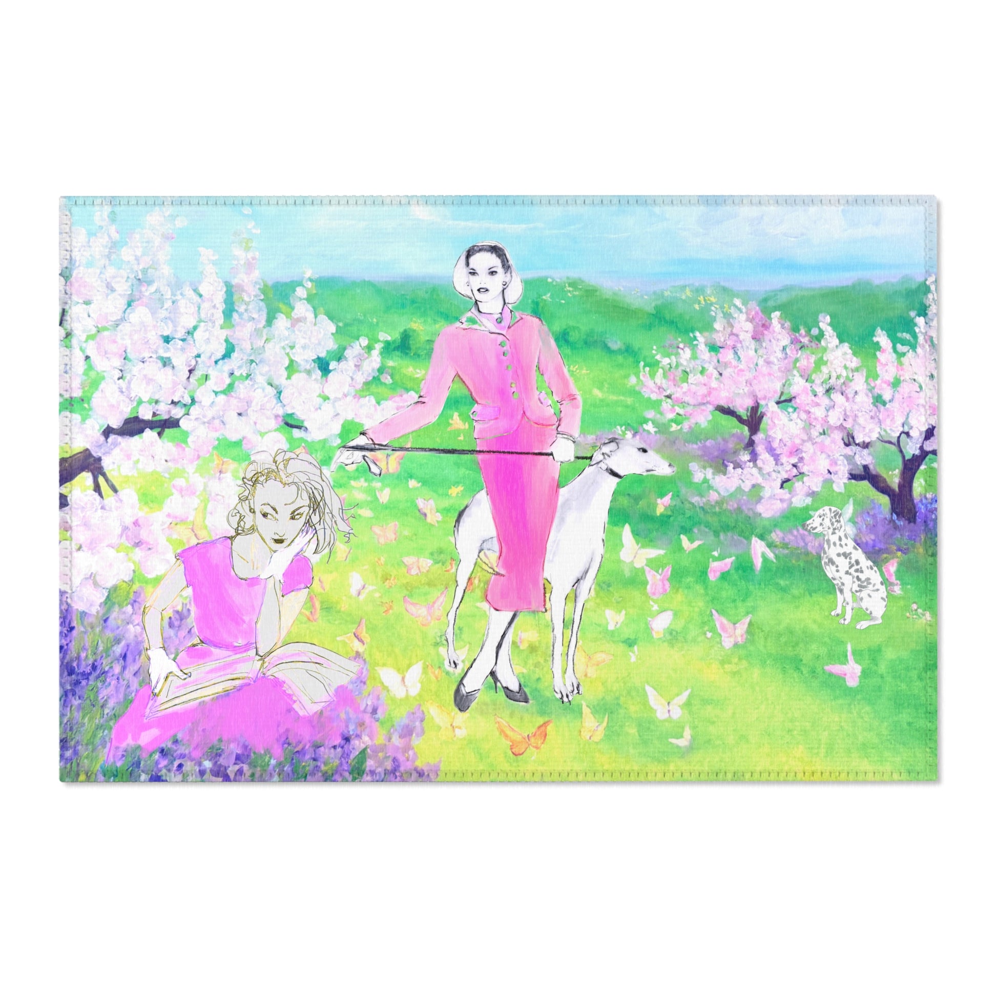 Step into a sun-dappled morning in the park with this charming area rug. Women handdrawn by Laurie Hoogland and wander along winding paths by Luke Borst with dogs at their sides, blossoms drifting on a gentle breeze, and every color feels alive with the joy of spring. This rug captures that carefree, artful spirit—bringing a touch of the outdoors and the warmth of a spring day into your home.
