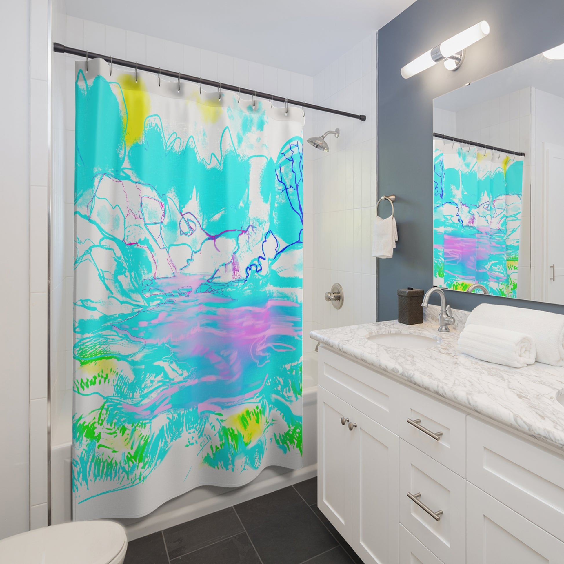 There’s something delightful about stepping into your bathroom and feeling like you’ve just stepped into nature. This beautiful landscape shower curtain, designed byartist Joel borst, transforms an ordinary space into a peaceful retreat, filled with the light, texture, and serenity of the outdoors.