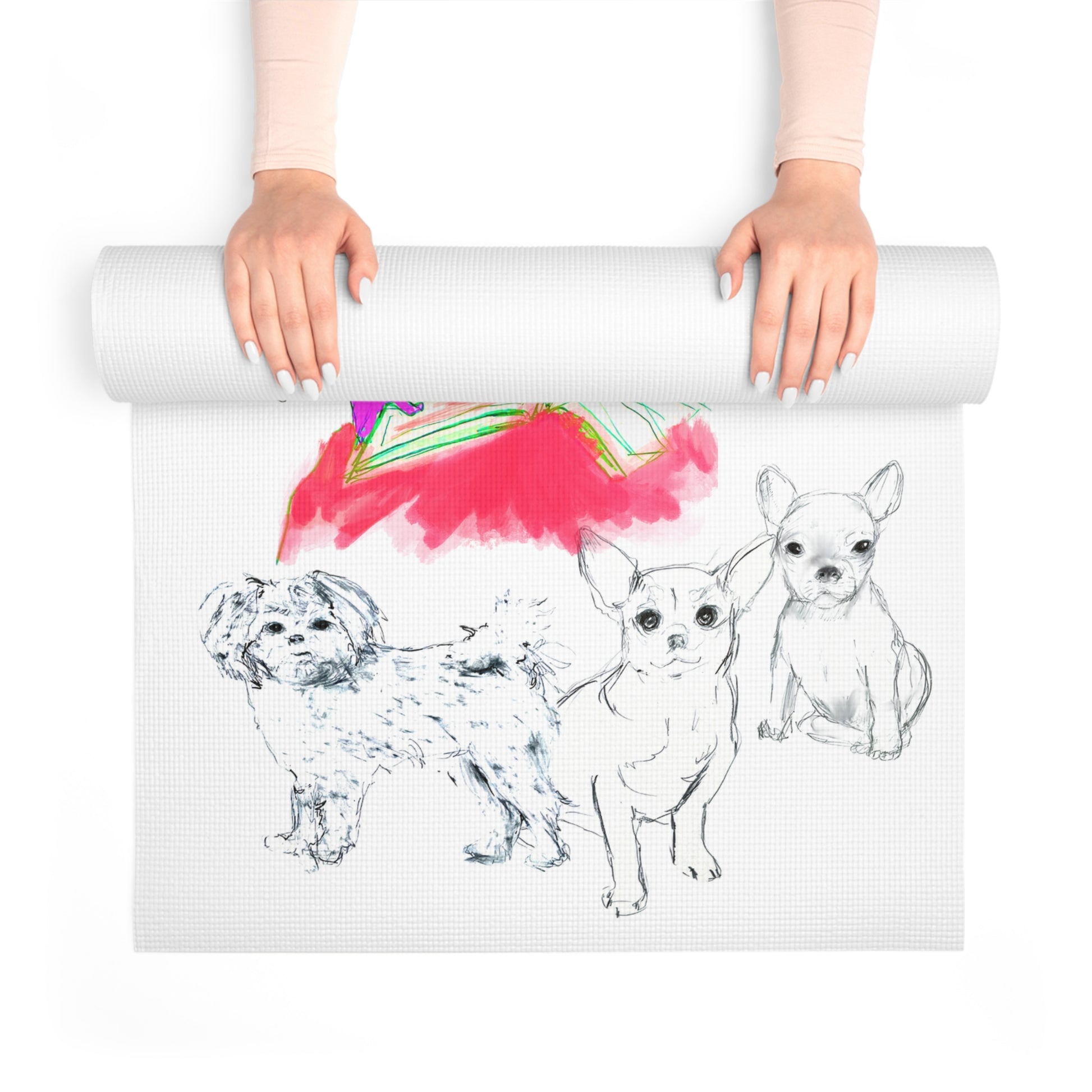 Workouts just got way more fun! Laurie Hoogland’s whimsical fancy girls and their favorite dogs dance across this colorful yoga mat, turning every stretch into a playful story. It’s part exercise mat, part art piece, and totally a mood booster.