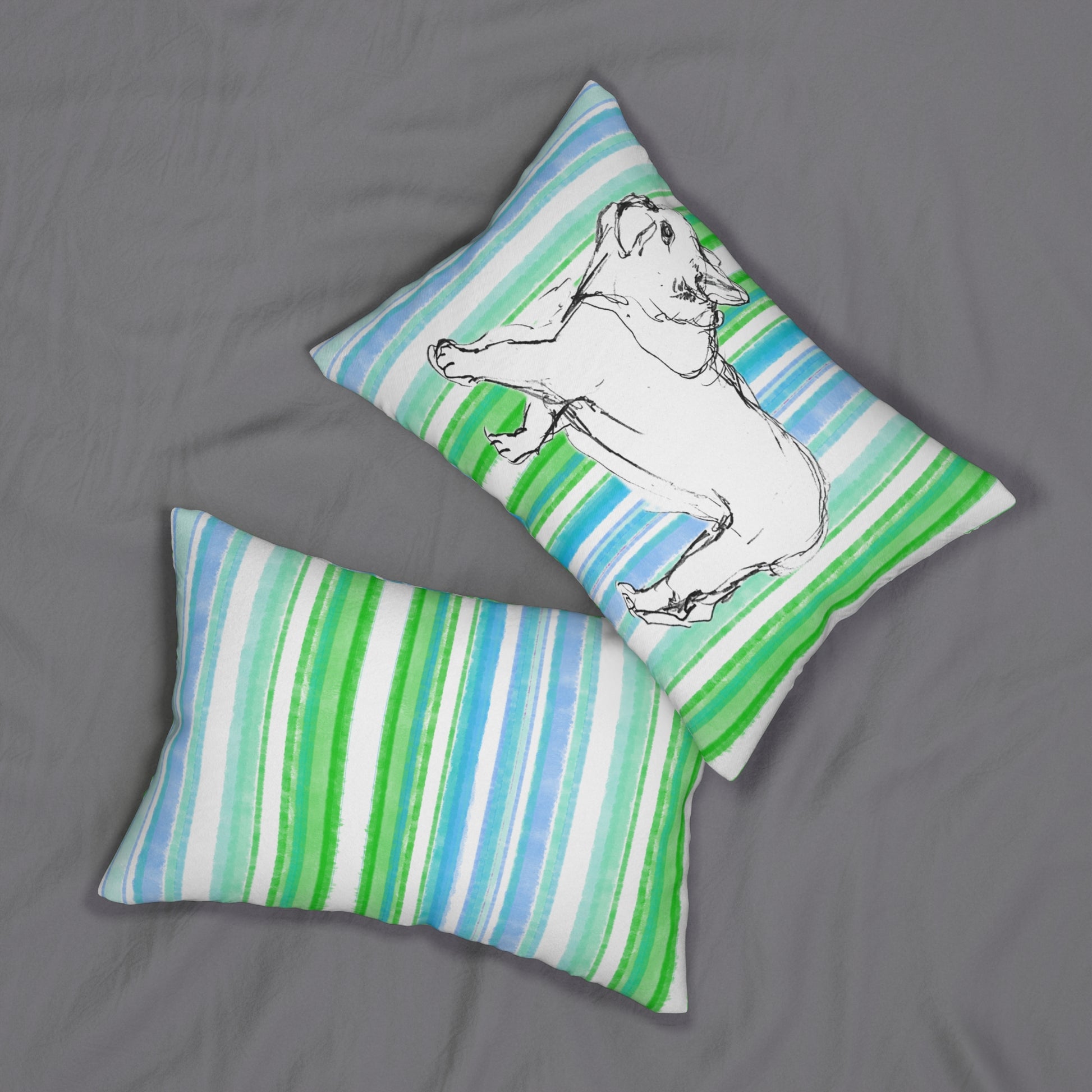 Add a touch of playful charm and comfort to your home with this beautiful spun-polyester lumbar pillow featuring Laurie Hoogland’s hand-drawn dog, brought to life with Periwinkles Design’s joyful watercolor stripes. It’s a cheerful piece of art that brightens any space — from your favorite reading chair to the sunny spot where your pup loves to nap.