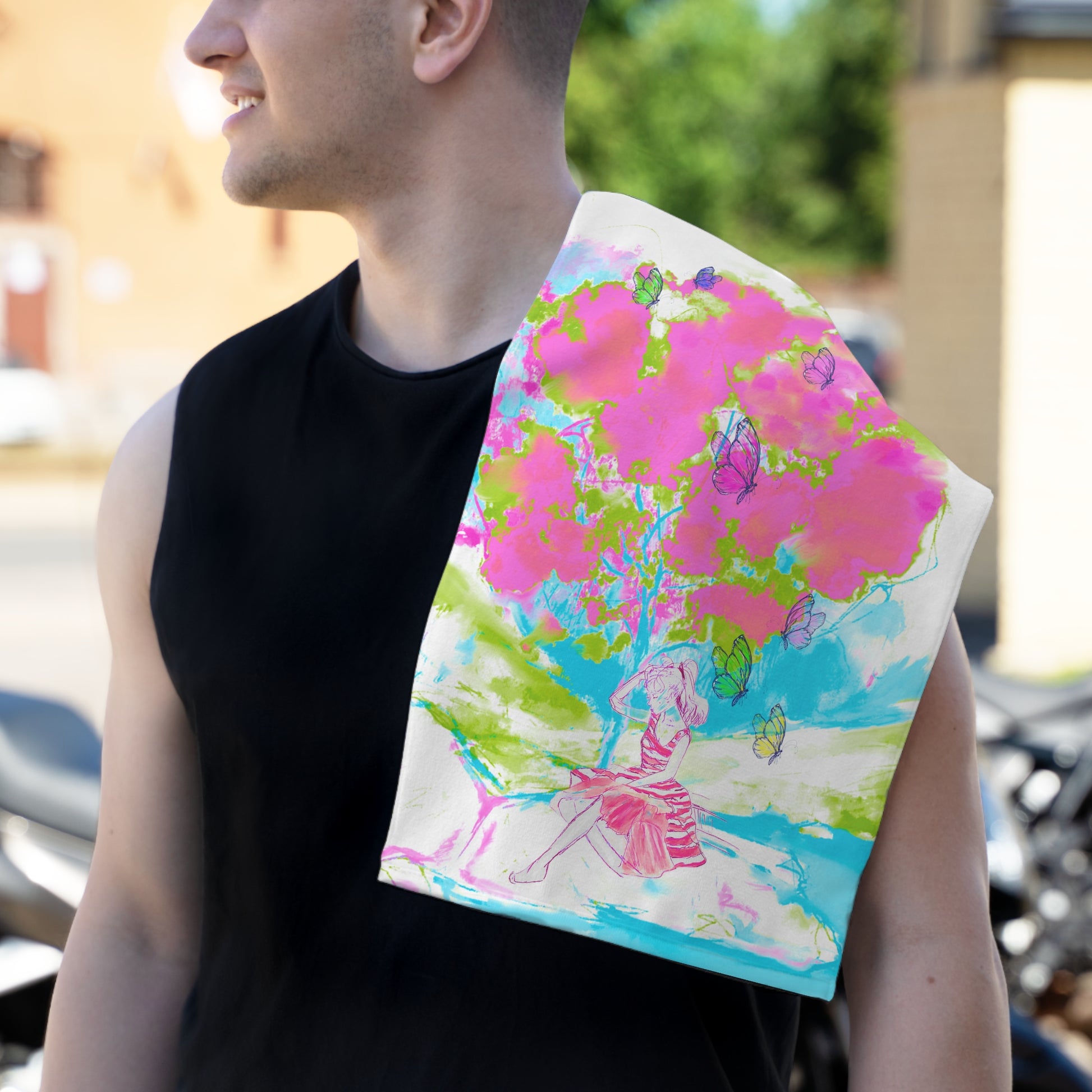 Step into a world of gentle whimsy every time you reach for this towel! “Butterfly Daydream” captures a girl resting peacefully under a soft pink tree, surrounded by fluttering butterflies dancing all around. With delicate watercolor hues and a dreamy scene, this towel brings a touch of magic and calm to your everyday routine.