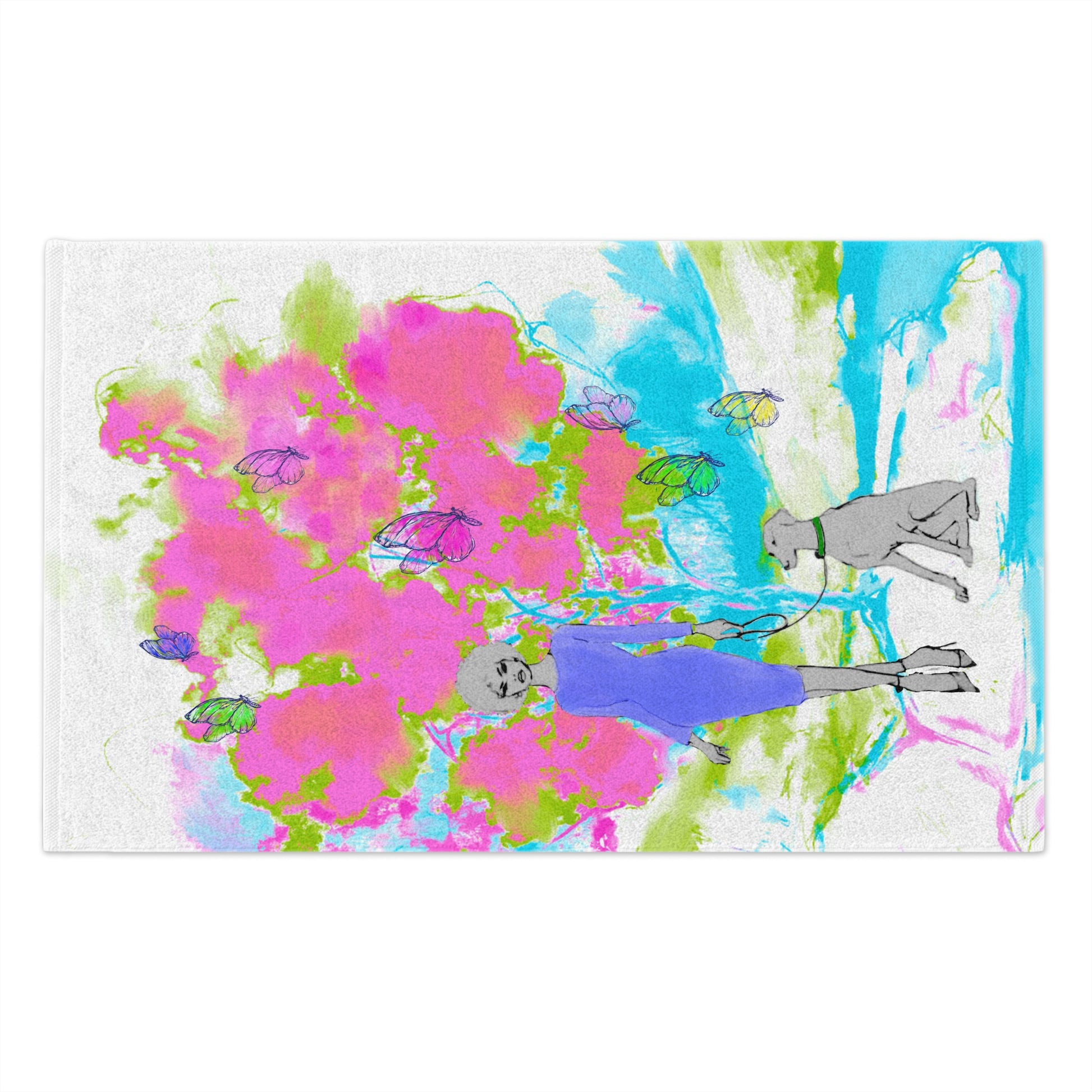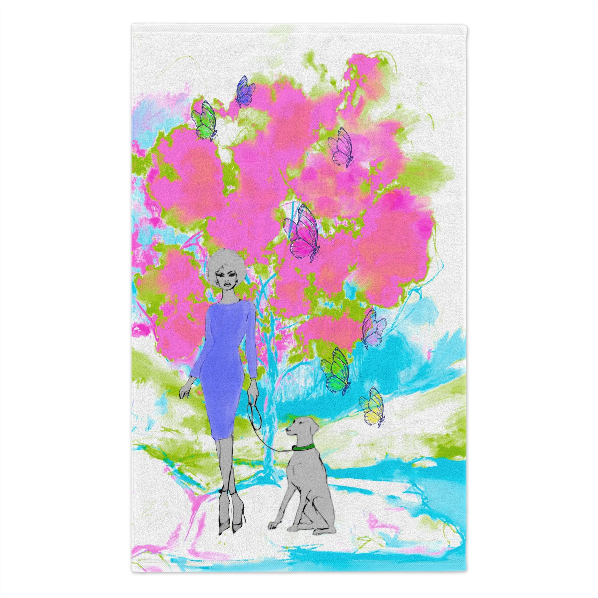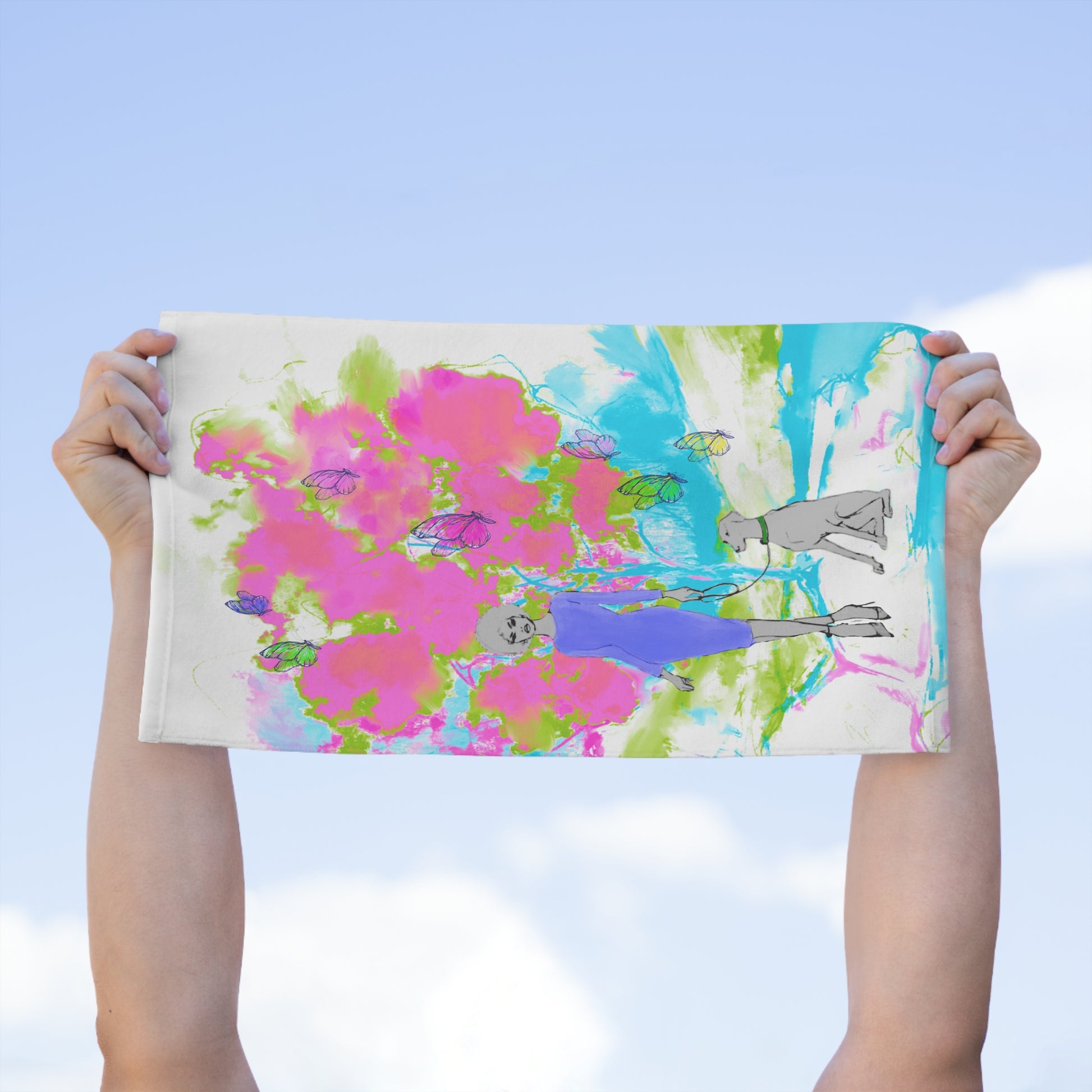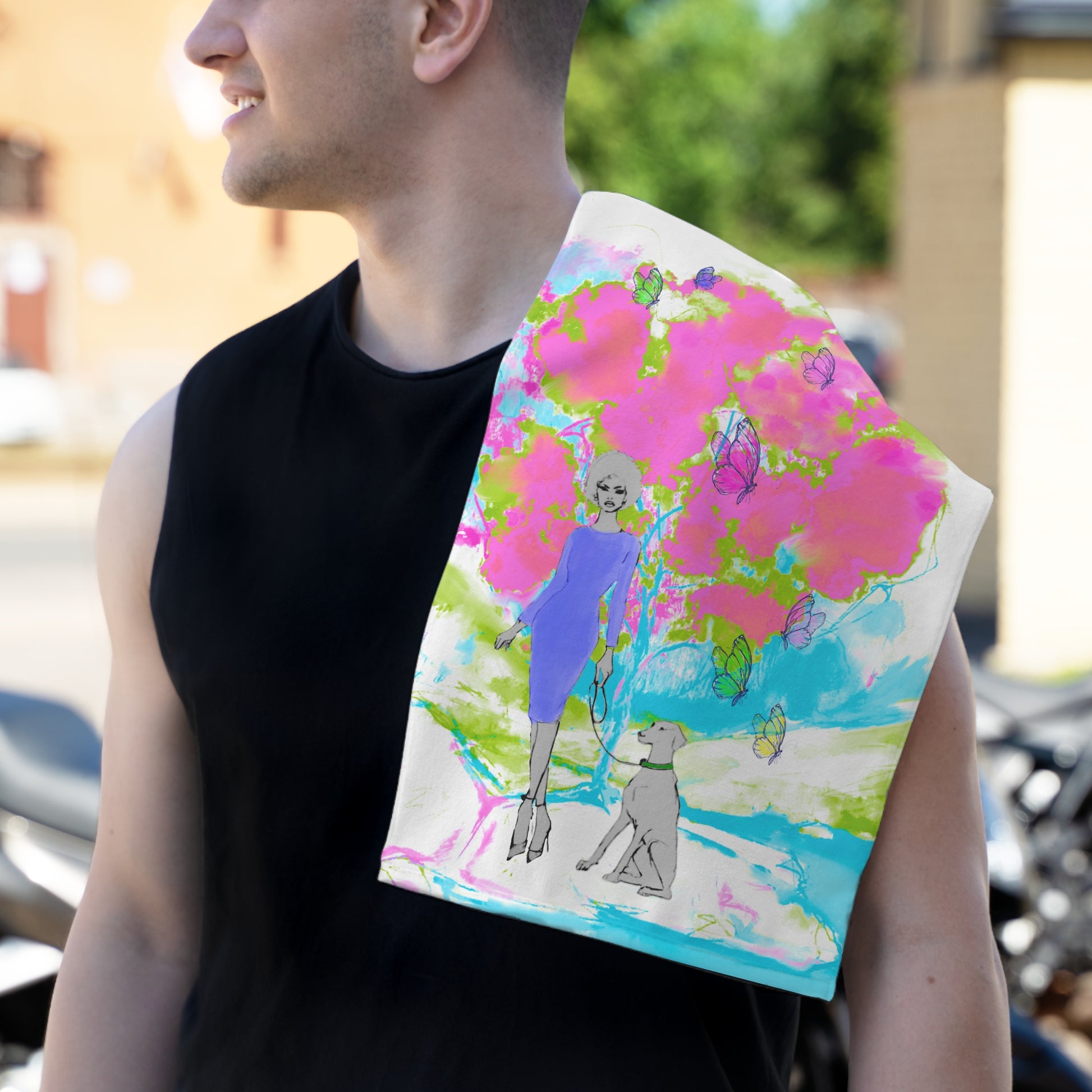 Featuring a heartwarming scene by Laurie Hoogland and Joel Borst, “Faithful Friend” depicts a lady standing with her loyal dog under a blooming pink tree—a joyful moment frozen in watercolor for you to carry into everyday life. Whether you’re using it for a walk, at the gym, or as a cheerful decorative touch in your powder room, this towel adds a splash of happiness wherever it goes.