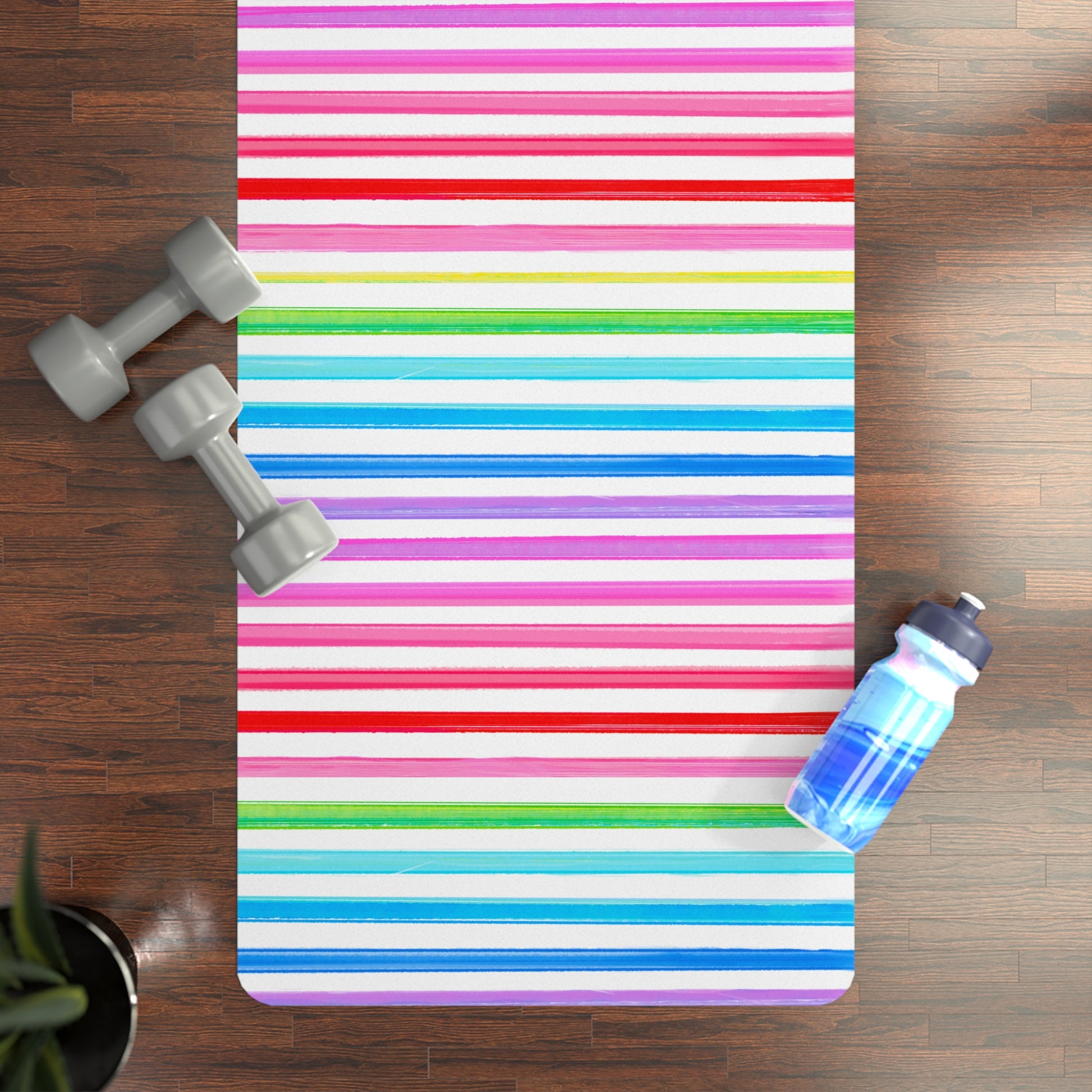 You'll feel great doing your stretches on the Watercolor Stripes created by Lois Moore. Any outfit youy are wearing will look great on this multi-colored energy filled color. With an anti-slip rubber bottom for extra stability, this yoga mat helps you better balance during any pose and absorbs impact, delivering a higher comfort factor for all your exercise.